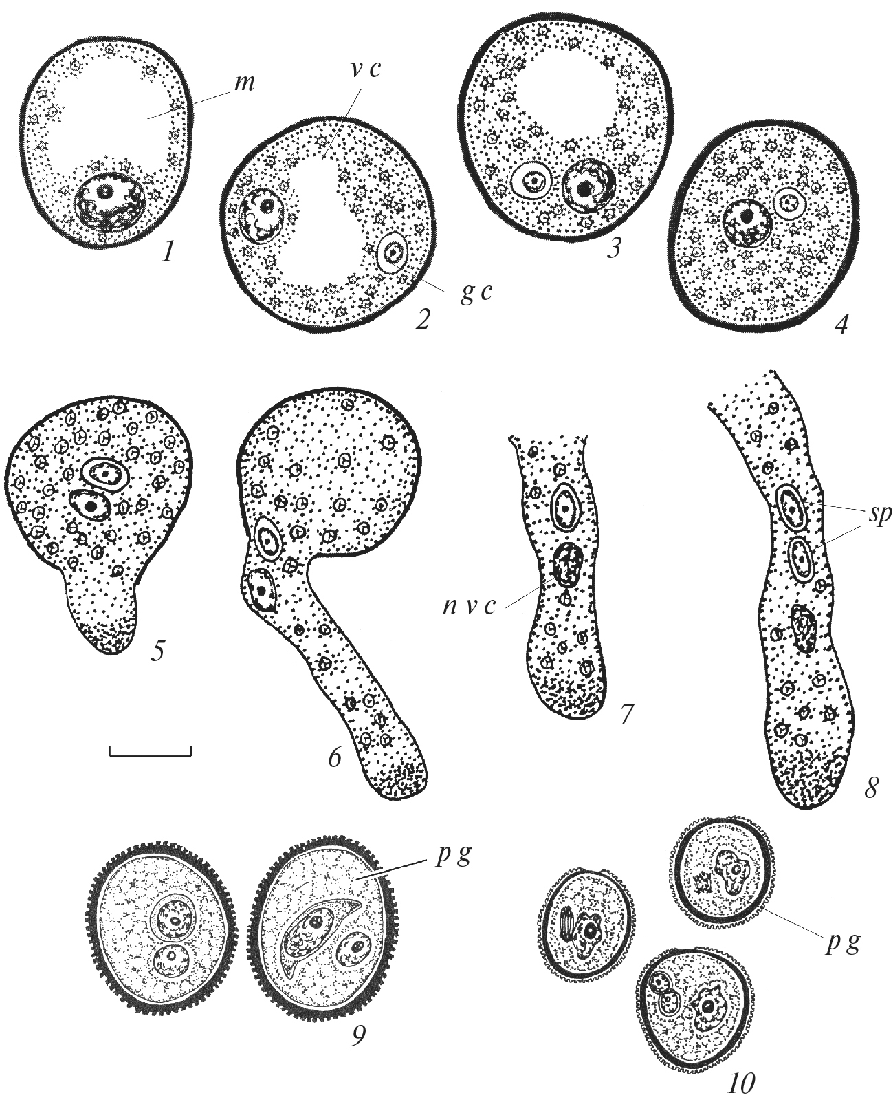 Fig. 1. Formation of pollen grains and pollen tubes. 1–4 – Ceratophyllum demersum, 5–8 – C. platyacanthum (Ceratophyllaceae), 9 – Gagea stipitata (Liliaceae), 10 – Hemerocallis citrina (Hemerocallidaceae). (1–8 – after Shamrov, 1983; 9 – after Shamrov, 1990a; 10 – after Shamrov, 1990b). g c – generative cell, m – microspore, n v c – nucleus of vegetative cell, p g – pollen grain, sp – sperm, v c – vegetative cell. Scale bar, µm: 30.