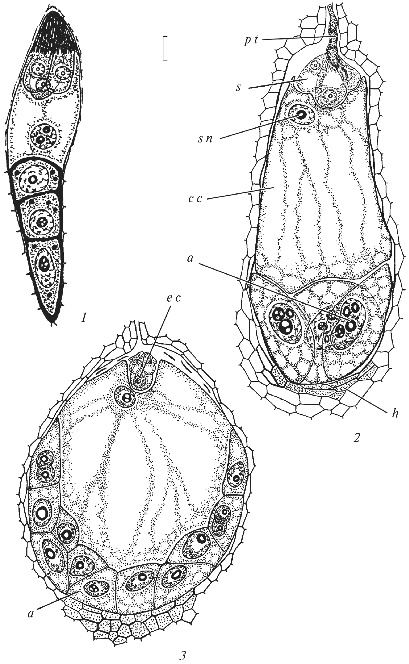 Fig. 5. Mature embryo sac structure in Hemerocallis hybrida (Hemerocallidaceae) (1), Gentianopsis barbata and Gentianella lingulata (Gentianaceae) (2, 3). (1 – after Shamrov, 1990b; 2, 3 – after Shamrov, 1988). a – antipodal cells, c c – central cell, e c – egg cell, h – hypostase, p t – pollen tube, s – synergid, s n – secondary nucleus of central cell. Scale bar, µm: 30.