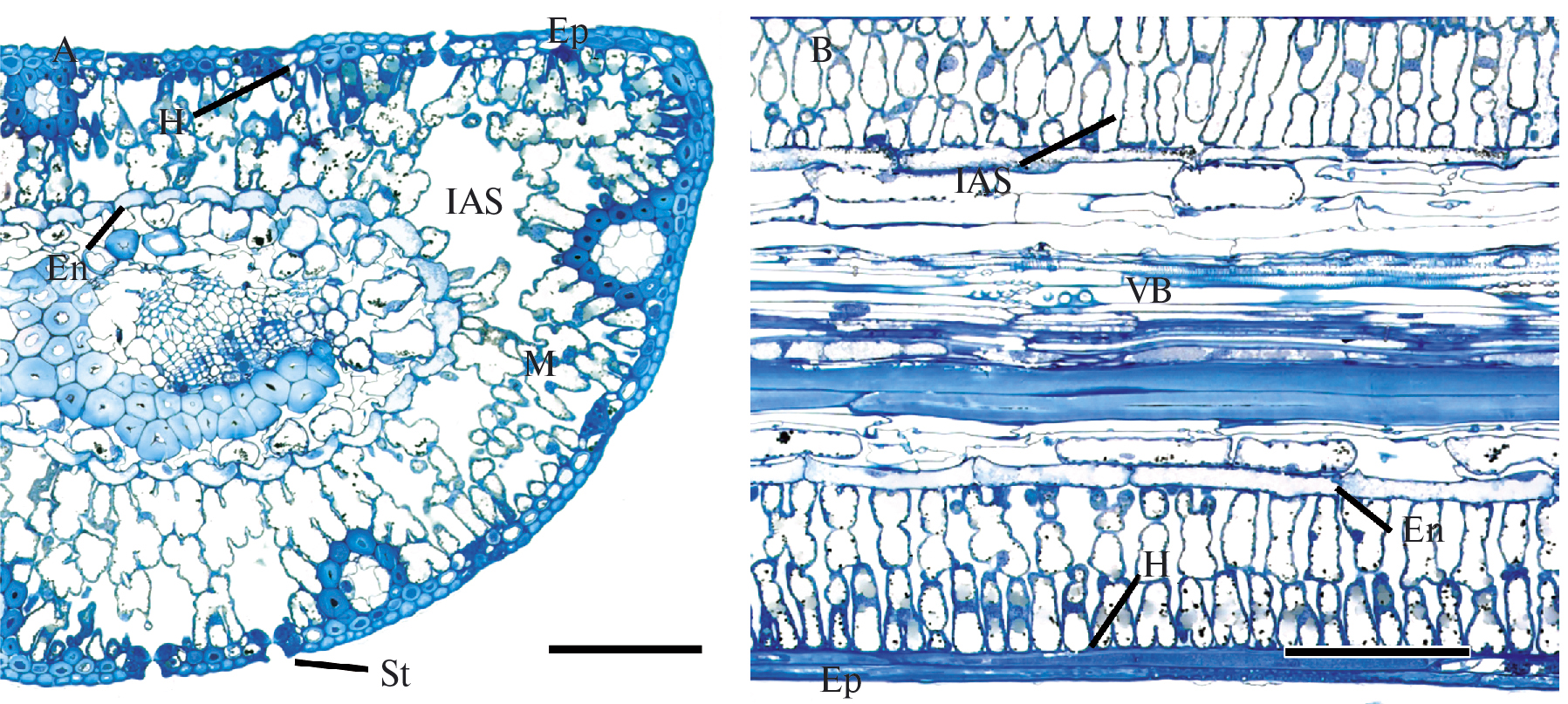 Fig. 1. General anatomy of Pinus sylvestris needles on cross (A) and longitudinal (B) sections, August. En – endodermis; Ep – epidermis; H – hypodermis; IAS – intercellular airspace; M – mesophyll; St – stomata; VB – vascular bundle. Scales: A, B, 150 µm.