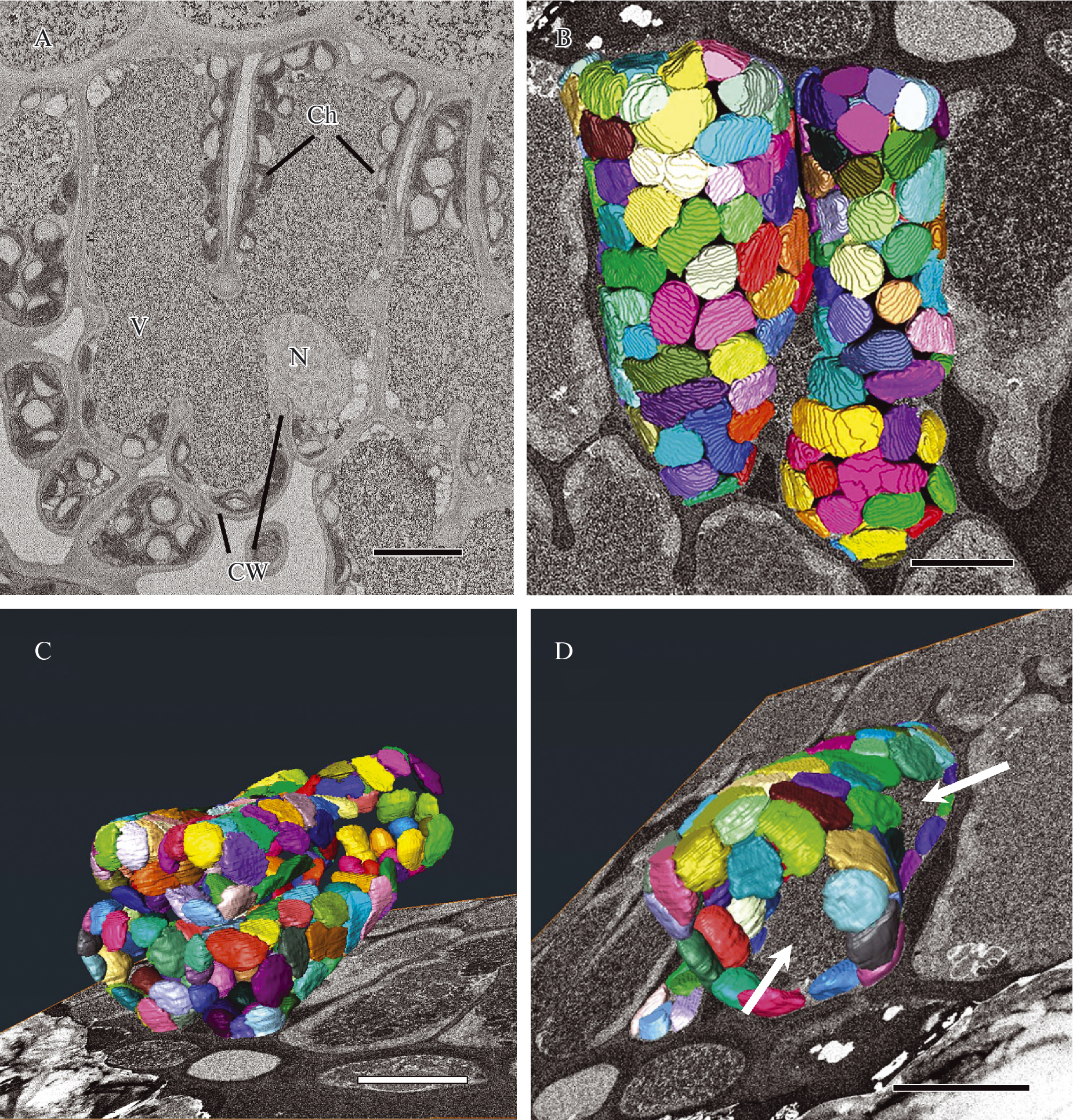 Fig. 5. 3D reconstruction of chloroplasts in mesophyll cells of Pinus sylvestris during winter (November–April). A. Cross section in the midplane of the cell. B, C. 3D reconstruction of chloroplasts grouped in one of the mesophyll cell lobe (cell wall is not presented on the reconstruction), view from the lateral side of the cell (B) and view from the hypodermis (С). D. 3D reconstruction of a single chloroplast viewed from different sides showing irregular shape and several protrusions. Ch – chloroplasts; CW – cell wall; N – nucleus; V – vacuole. Scales: A–C, 10 µm; D, 5 µm.
