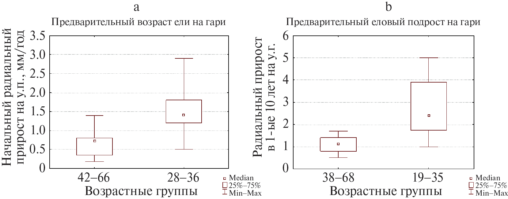 Рис. 6. Сравнение начальных радиальных приростов на у.п. (а) и на у.г. (b) елового подроста на гари и на сплошных вывалах (без разделения на предварительный и последующий).