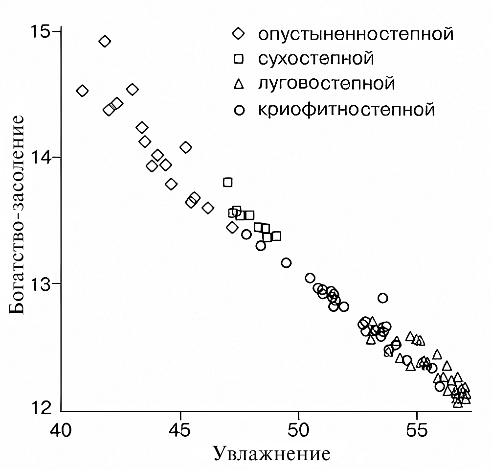 Для разработки системы эколого-ценотических элементов степной флоры гор Южной Сибири актуальным является выявление групп сопряженно растущих видов. Для выделения последних использовался метод корреляционных плеяд (Vasilevich, 1969) с применением программы IBIS3.0 (Zverev, 1998). Виды, имеющие значительное количество связей с видами других плеяд, рассматривались как переходные внутри данной плеяды. Для вычисления положения каждого вида на экологических градиентах использовались стандартные экологические шкалы для степной и пустынной зон (Metodicheskie ukazaniya…, 1974).
