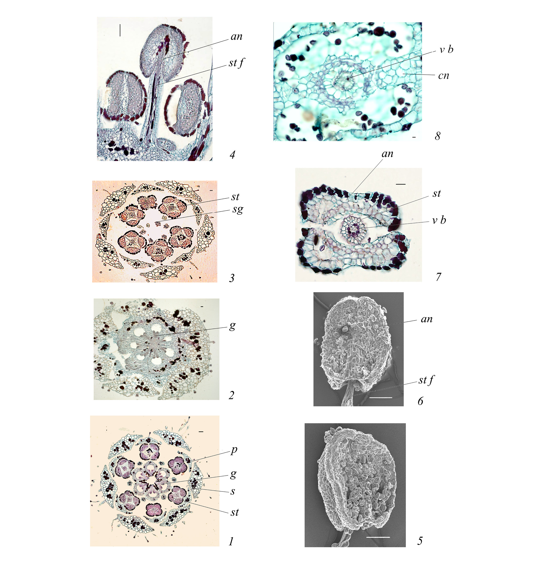 1–3 – 6-членный (1), 7-членный (2) и 5-членный (3) цветки, видны железистые волоски на чашелистиках и лепестках; 4 – положение тычинок на цветоложе, внутренние тычинки имеют более длинные тычиночные нити; 5, 6 – строение тычинки (СЭМ), видны теки пыльника (3) и вертикальный шов в результате срастания микроспорангиев в верхней части пыльника (6); 7, 8 – строение пыльника в нижней (7) и средней (8) частях; an – пыльник, cn – связник, g – гинецей, p – лепесток, s – чашелистик, sg – рыльце, st – тычинка, st f – тычиночная нить, v b – проводящий пучок. Масштабная линейка, мкм: 1, 4 – 50; 2, 3, 7 – 20; 5, 6 – 100; 8 – 5.