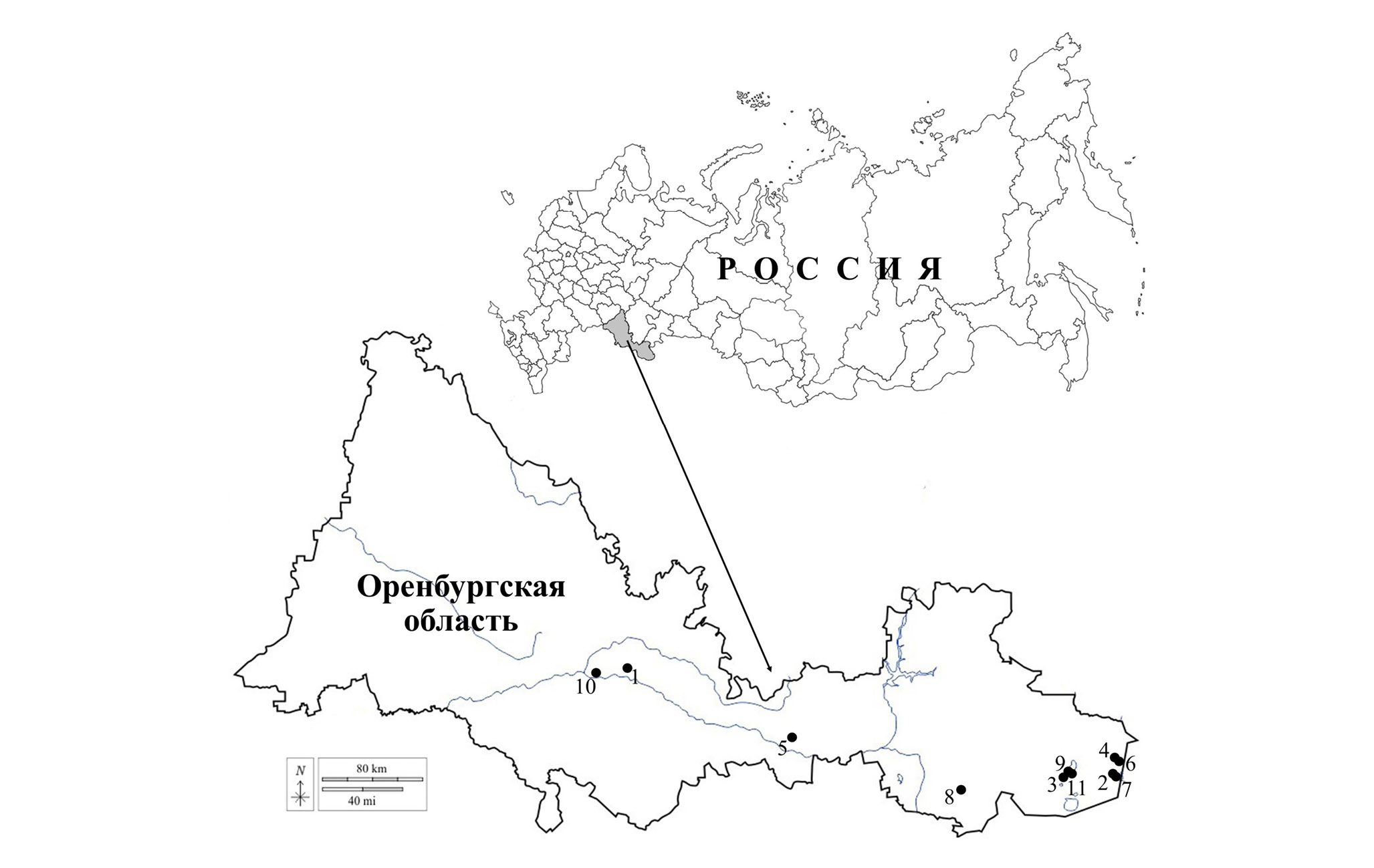 Авторы выражают искреннюю благодарность к. б. н. старшему научному сотруднику отдела ландшафтной экологии Института степи Оренбургского федерального исследовательского центра Ольге Геннадьевне Калмыковой, сотрудникам биологического заказника областного значения “Светлинский”, а также директору ГКУ Оренбургской области “Дирекция ООПТ” Александру Андреевичу Семенову за оказанную помощь в проведении полевых сборов.