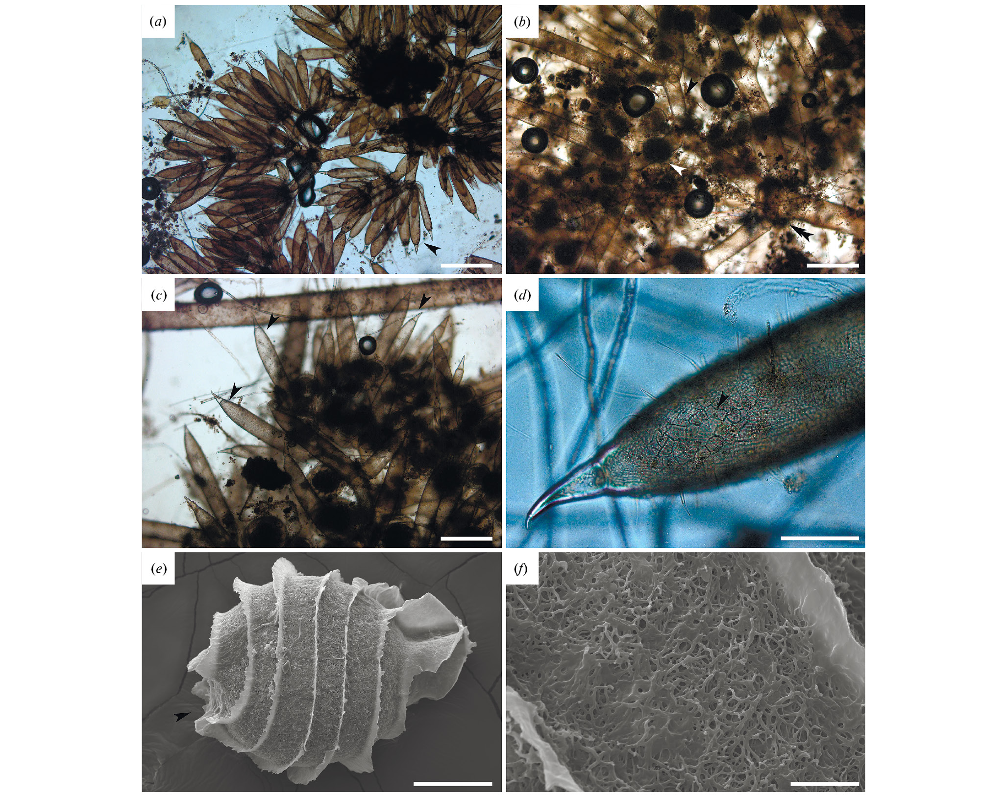 Рис. 1. Диагностические признаки Nitella hyalina (a), N. wahlbergiana (b, c, e, f), внешний вид Coleochaete nitellarum (d) из оз. Колыванское, Алтайский край: a – мутовка листьев с короткими акцессорными листьями (стрелка); b – компактные фертильные листья с укороченными вторичными сегментами (стрелки), двойная стрелка указывает на узел стебля; c – двуклеточные последние сегменты компактных фертильных листьев (стрелки); d – таллом C. nitellarum (стрелка) в клеточной стенке последнего сегмента распростертого стерильного листа N. wahlbergiana; e – внешний вид ооспоры с резко выступающими ребрами, переходящими в нежную бахрому, образующую на вершине высокий воротничок (стрелка указывает на базальный полюс); f – губчатая поверхность ооспоры. Масштаб: (a–c) – 0.4 мм; (d, e) – 0.1 мм; (f) – 10 мкм.