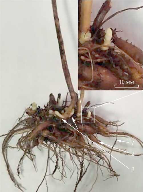 Рис. 1. Подземная часть растений Hylotelephium triphyllum: 1 – корни; 2 – клубни; 3 – почки возобновления.