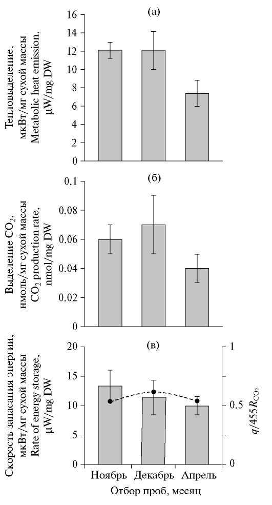 Калориметрические определения количества запасаемой энергии в почках H. triphyllum, находящихся в состоянии вынужденного покоя, показали, что в период ноябрь–декабрь меристематические ткани почек характеризовались интенсивным метаболизмом. Количество запасаемой энергии в почках H. triphyllum в зимний период составляло в среднем около 14 мкВт/мг сухой массы, в конце апреля количество запасаемой энергии снизилось до 10–12 мкВт/мг сухой массы (рис. 2в). В осенне-зимний период (ноябрь, декабрь) интенсивность дыхания почек возобновления при температуре 20°C составляла 0.06–0.07 нмоль/мг сухой массы (или 9–11 мг СО2 /г сухой массы в час) (рис. 2б). В целом в зимний период (декабрь) почки характеризовались повышенной скоростью тепловыделения и дыхания (рис. 2а, б).