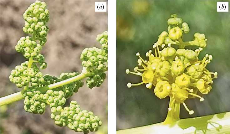 У ранее цветущих особей 2023 г., как и в 2021–2022 гг., число тычиночных цветков составило 50–60% общего числа цветков, при этом 98% из них располагались на паракладиях. Лишь у отдельных особей на некоторых боковых кистях в верхней части синфлоресценции 1–2% простых зонтиков состояли только из тычиночных цветков. Все остальные простые зонтики синфлоресценции включали только обоеполые цветки (рис. 3b).
