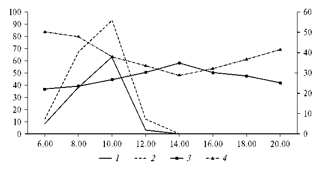 Рис. 6. Суточная ритмика цветения Dorema microcarpum. По оси Х – часы наблюдений; по левой оси Y – число раскрывшихся цветков; по правой оси Y – относительная влажность и температура воздуха; 1 – число раскрывшихся обоеполых цветков; 2 – число раскрывшихся тычиночных цветков; 3 – температура воздуха; 4 – относительная влажность воздуха.