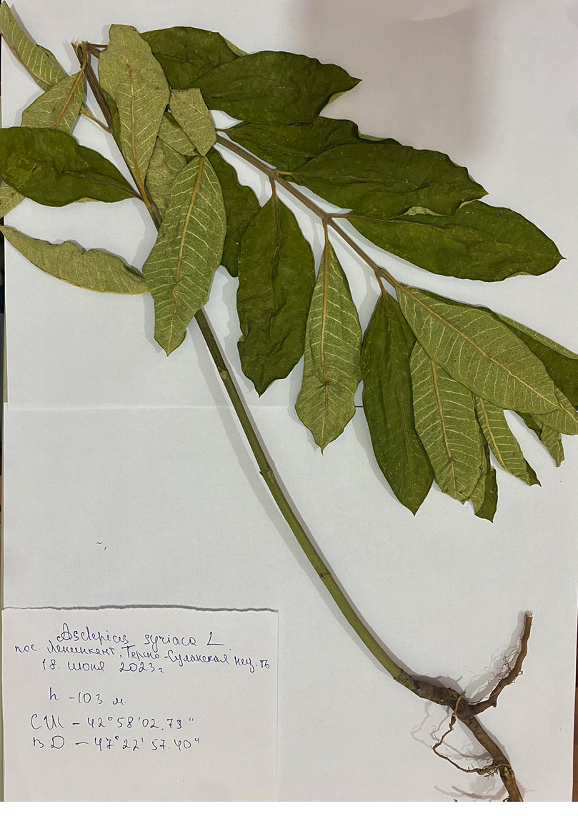 Гербарный образец вида хранится в гербарии Горного ботанического сада ДФИЦ РАН (DAG) (рис. 3): Asclepias syriaca L. РД: пос. Ленинкент, Терско-Cулакская низменность, мезофитный луг, частный питомник; 42.967442° с. ш., 47.382611° в. д., 103 м над ур. м., 18 VI 2023, З.М. Асадулаев, З. И. Абдурахманова (DAG).