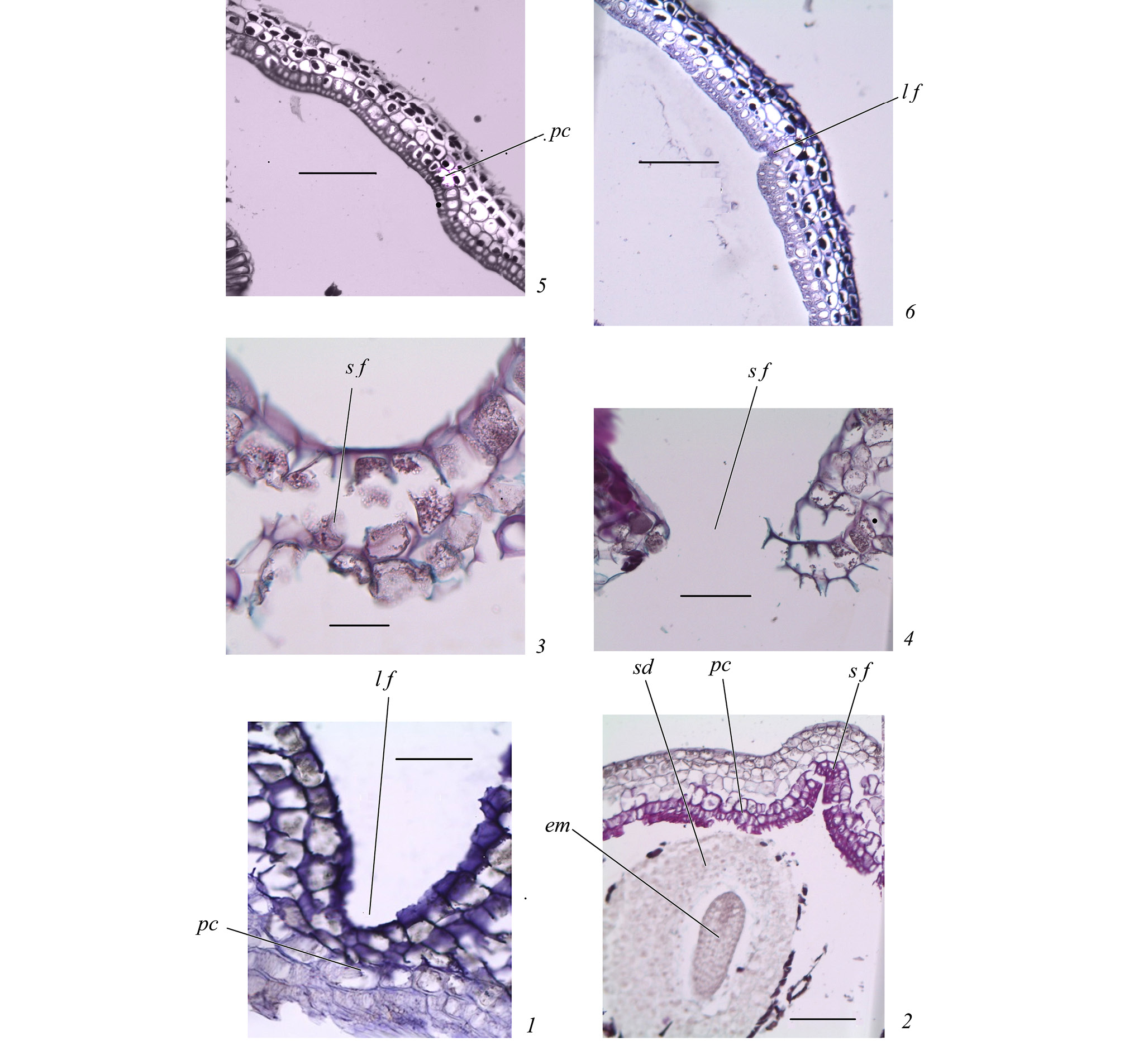 1, 2 – локулярная ( 1 ) и септальная ( 2 ) борозды плода перед вскрыванием; 3, 4 – вскрывание в основании плода в области септальной борозды: фаза 1 – клетки трех внутренних слоев перикарпия с утолщенными полисахаридными стенками разрушились ( 3 ), фаза 2 – клетки трех наружных слоев перикарпия с тонкими стенками (в протопласте видны гранулы, возможно, кристаллы) разрушились ( 4 ); 5, 6 – вскрывание на верхушке плода в области локулярной борозды: в перикарпии клетки двух внутренних слоев характеризуются утолщенными полисахаридными стенками, а клетки трех–четырех наружных слоев – тонкими стенками (в протопласте накапливаются танины) ( 5 ), в области вскрывания дегенерируют клетки внутренних слоев, а клетки наружных слоев еще не разрушились ( 6 ). em – зародыш, l f – локулярная борозда, pc – перикарпий, sd – семя, s f – септальная борозда .