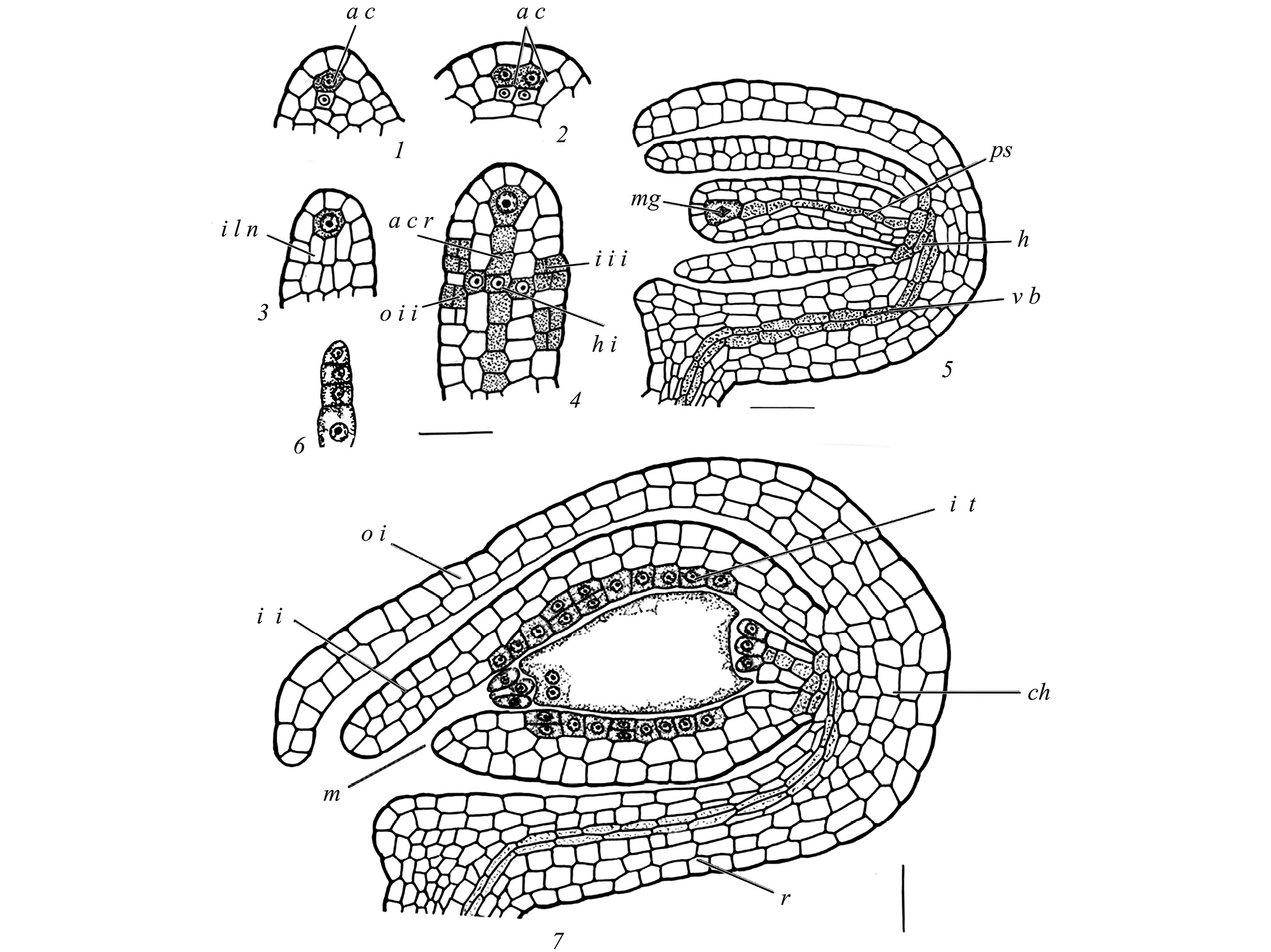1–3 – семязачаток, возникающий на плаценте, выделение археспориальных клеток, осевого ряда клеток, инициалей латеральной и базальной областей нуцеллуса; 4 – дифференцирующийся примордий семязачатка, выделение инициалей гипостазы, наружного и внутреннего интегументов; 5 – семязачаток на стадии мегаспорогенеза; 6 – тетрада мегаспор; 7 – семязачаток перед опылением. a с – археспориальная клетка, a c r – осевой ряд клеток, с h – халаза, h – гипостаза, h i – инициали гипостазы, i i – внутренний интегумент, i i i – инициали внутреннего интегумента, i l n – инициали латеральной области нуцеллуса, i t – интегументальный тапетум, m – микропиле, mg – мегаспороцит, o i – наружный интегумент, o i i – инициали наружного интегумента, ps – постамент, r – рафе, v b – проводящий пучок.