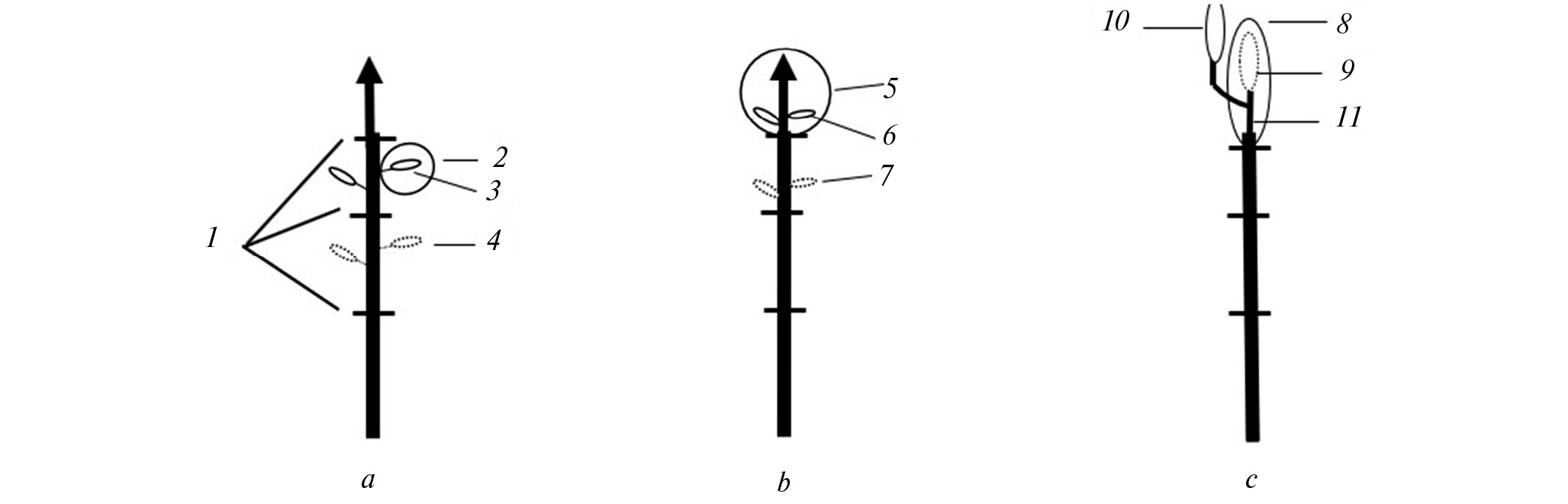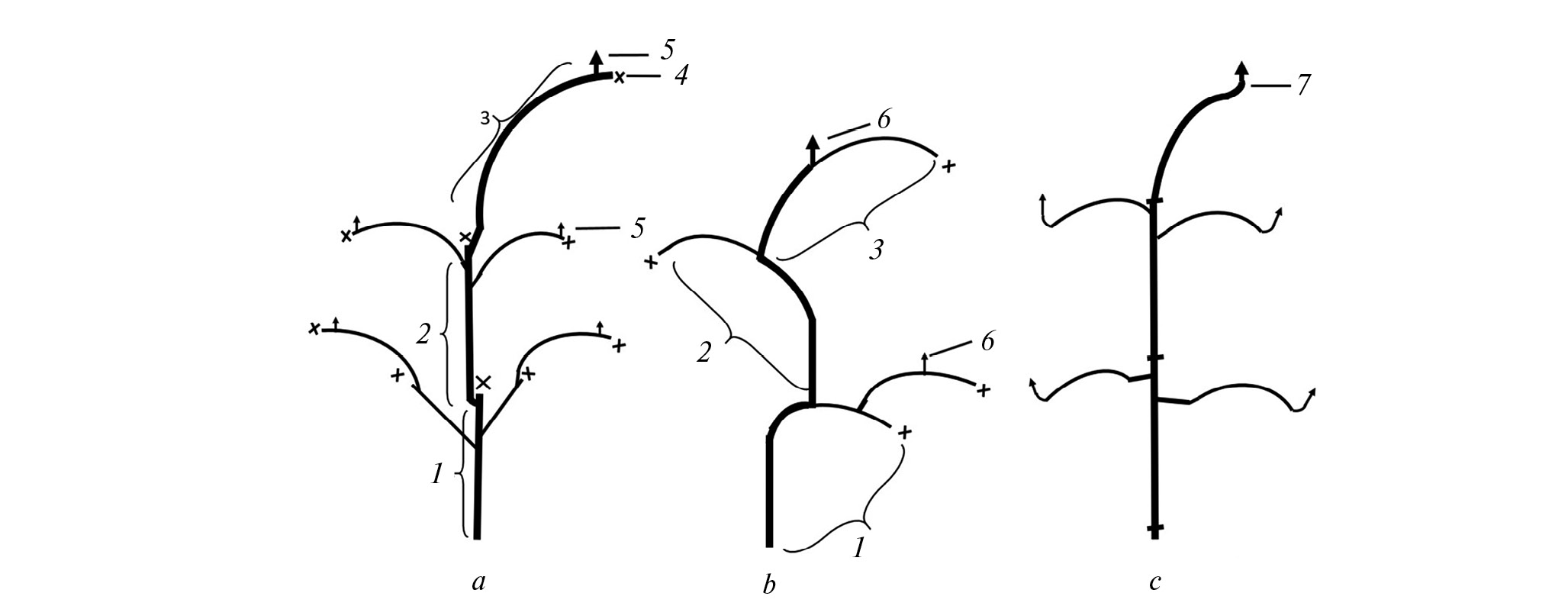 Fig. 1. Location of generative shoots on skeletal axes: a – a single-season generative shoot with a terminal inflorescence. It is formed from an axillary bud; b – a generative shoot with axillary inflorescences. It is formed from an apical bud; c – a generative shoot with a terminal inflorescence. It is formed from an apical bud.