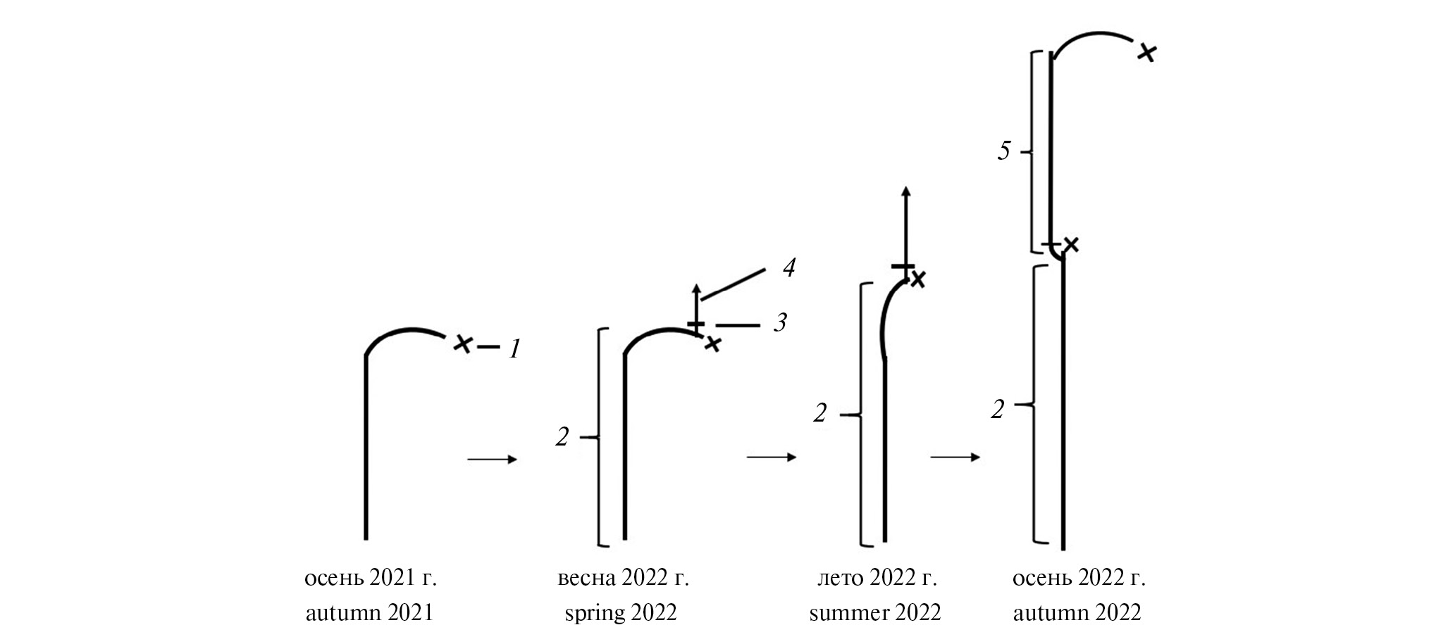 1 – borders between annual shoots; 2 – a shoot of replacement formed from a bud located in the distal part of the maternal shoot; 3 – a shoot from the apical bud, slowed down its development compared to the lateral shoot.