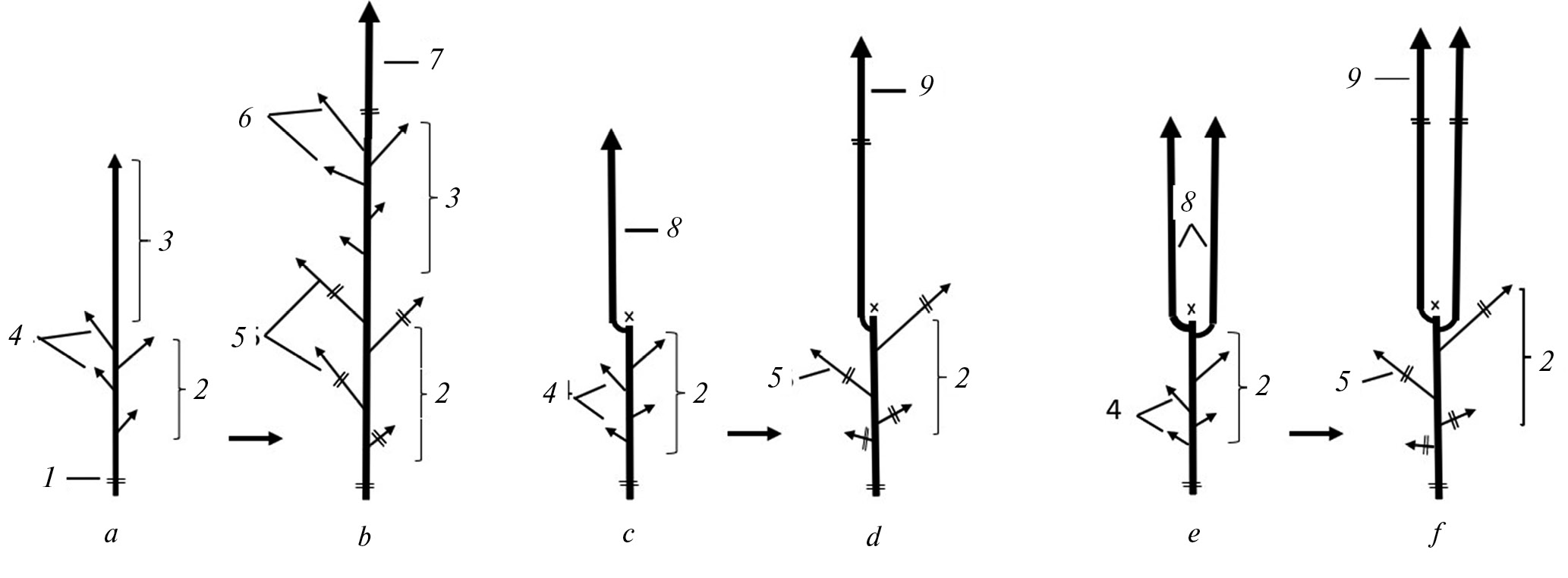 Рис. 5. Формирование двулетней системы побегов на основе силлептически ветвящегося материнского побега: а– b – формирование двулетней системы побегов на основе материнского побега, имеющего зону силлептических побегов и зону почек регулярного возобновления; c – d – формирование двулетней системы побегов на основе материнского побега, имеющего зону силлептических побегов, один из которых перевершинивает материнский; e – f – формирование двулетней системы побегов на основе материнского побега, имеющего зону силлептических побегов, два из которых перевершинивают материнский.
