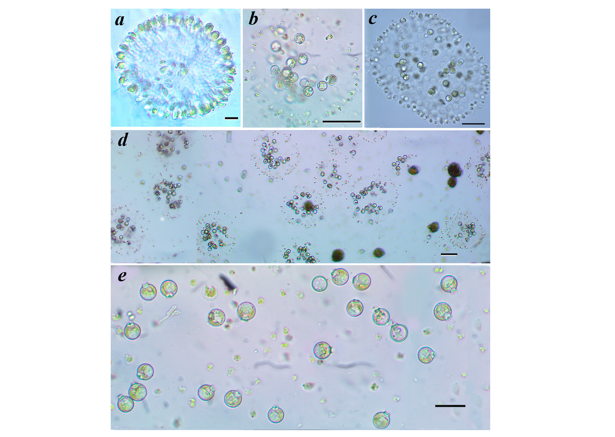 Рис . 2. Колонии Uroglena kukkii , СМ . Южноуральская популяция: а – колония; b , d – колонии с формирующимися стоматоцистами; e – стоматоцисты. С.-Петербург: c – колонии с формирующимися стоматоцистами в стадии деления из Фигурного пруда.