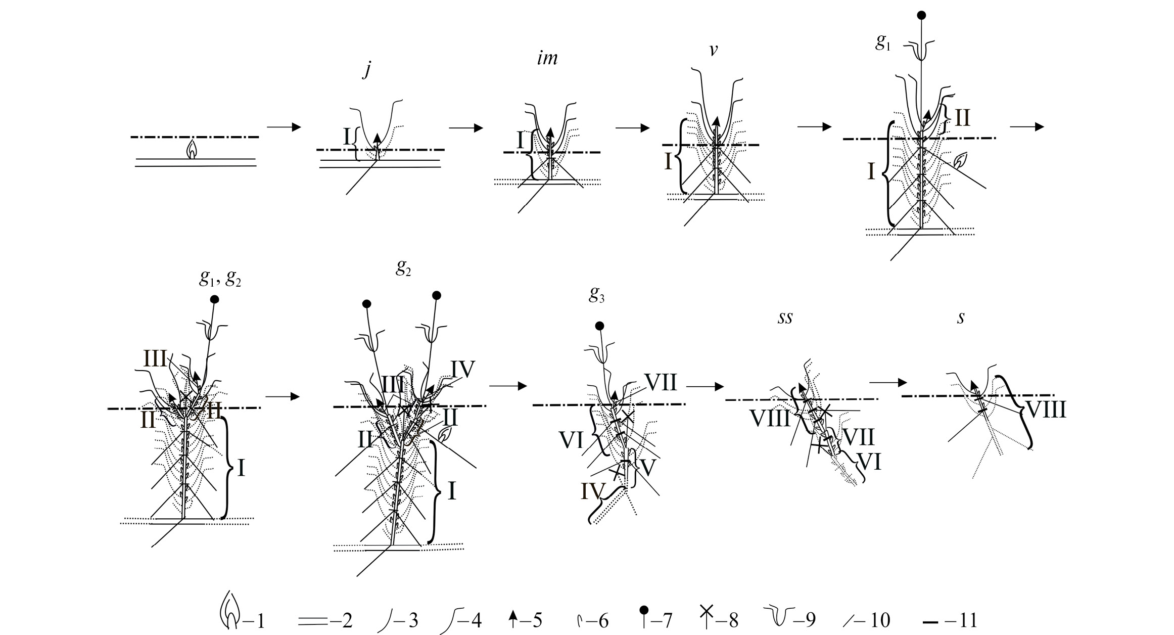 1 – adventitious bud; 2 – root of mother plant; 3 – cataphyll; 4 – green leaf; 5 – renewal bud; 6 – lateral bud; 7 – flower; 8 – dead generative stem; 9 – leaves of stem; 10 – additional root; 11 – line of annual growth. Dead parts of plants are indicated by dotted line. Soil surface is indicated by dash-dotted line. Order of branching is indicated by Roman numerals.