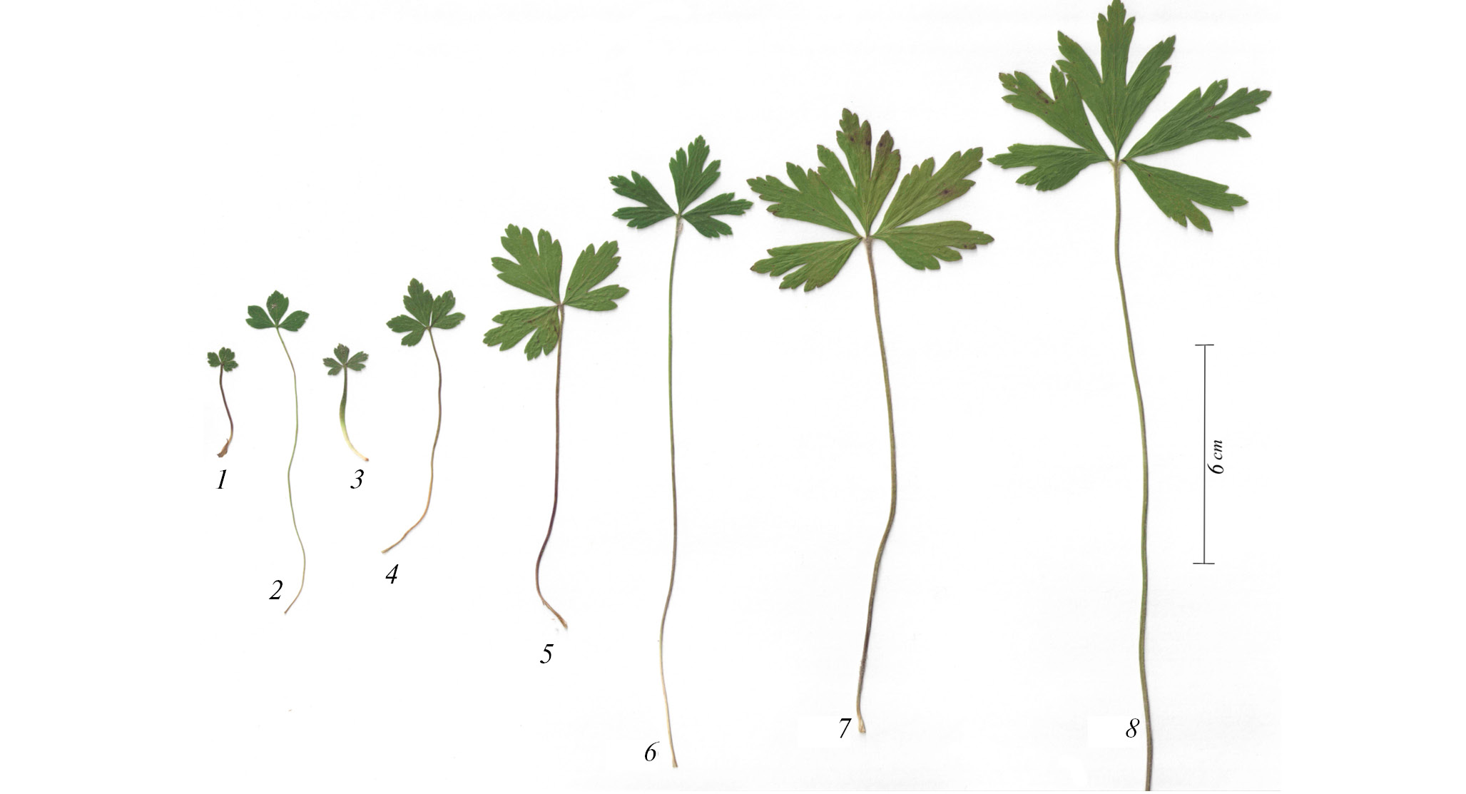 Рис. 3. Форма листьев Anemonoides sylvestris: 1–3 – листья ювенильного типа, 4–6 –листья полувзрослого типа, 7–8 – листья взрослого типа.