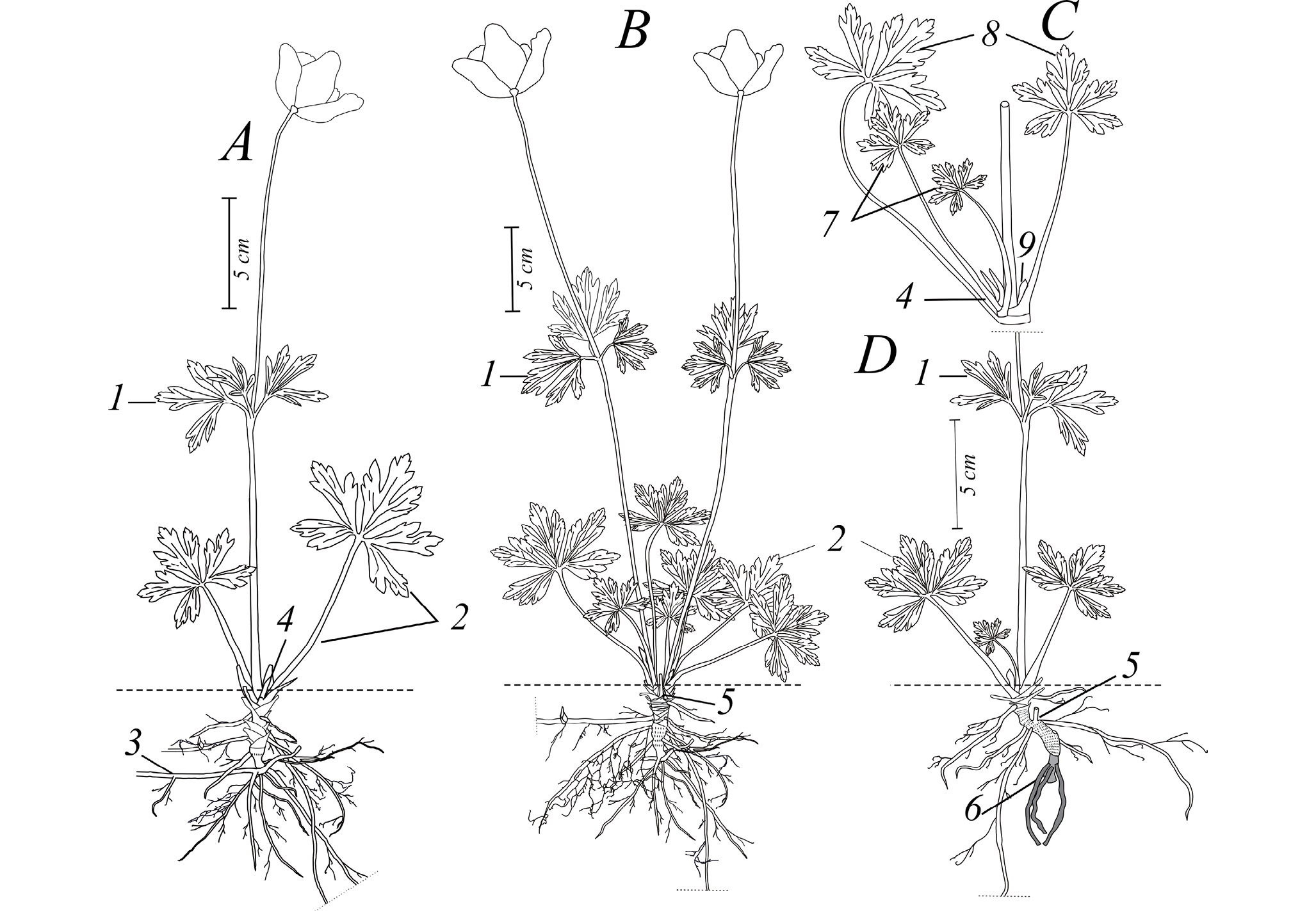 Ювенильные растения (j) вегетативного происхождения возникают из придаточных (адвентивных) почек, которые формируются обычно на горизонтально расположенных корнях более взрослых особей (рис. 1, 2A). Эти корни, как правило, расположены на глубине 3–10 см. Адвентивная почка, развивающаяся на корне, закрыта чешуевидными листьями. Из нее формируется побег n-го порядка, базальная часть которого расположена в почве. Этот подземный участок побега представляет собой первый прирост корневища (гипогеогенный по происхождению) и включается в состав осевой многолетней части побеговой системы молодого растения. Длина геофильного участка корневища зависит от глубины залегания придаточной почки. Если корень расположен близко к поверхности почвы, то формируется участок корневища небольших размеров. При глубоком заложении прирост увеличивается за счет значительной длины междоузлий метамеров (рис. 2B). Достигнув поверхности почвы, корневой отпрыск формирует из верхушечной почки надземный розеточный побег (рис. 2). Растение-отпрыск на данной стадии онтогенеза представляет собой однопобеговую партикулу. Надземный розеточный побег несет открытую верхушечную почку и два листа ювенильного типа (см. табл. 1). Их листовые пластинки тройчато рассеченные: верхний сегмент листа цельный с пильчатым краем в верхней трети, а два нижних сегмента, как правило, имеют две лопасти или доли (рис. 3, 1–3). У части ювенильных особей не образуются придаточные корни, поскольку питание осуществляется за счет связи с материнским растением. Однако обособление партикул происходит достаточно быстро. Большинство ювенильных растений, которые были выкопаны при исследовании, отделены от материнских организмов. Причины разделения трудноопределимы, по нашим наблюдениям это может происходить под воздействием роющих животных. Партикулы становятся способны к самостоятельному существованию, когда у растений формируется своя корневая система кистевого типа. Средняя продолжительность j состояния – один год, иногда затягивается до трех лет. В случае если растение остается ювенильным в течение 2–3 лет, осевые части прошлогодних укороченных приростов побега втягиваются придаточными корнями в почву, образуя эпигеогенный участок корневища, и, таким образом, корневище становится смешанным – гипоэпигеогенным.