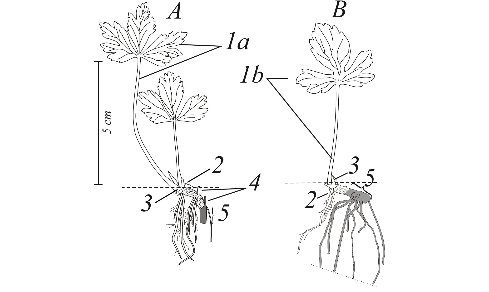 1a – лист полувзрослого типа; 1b – лист ювенильного типа; 2 – годичный прирост этого года; 3 – почка возобновления; 4 – отмерший стебель; 5 – отмершая часть корневища. Пунктиром обозначен уровень почвы.