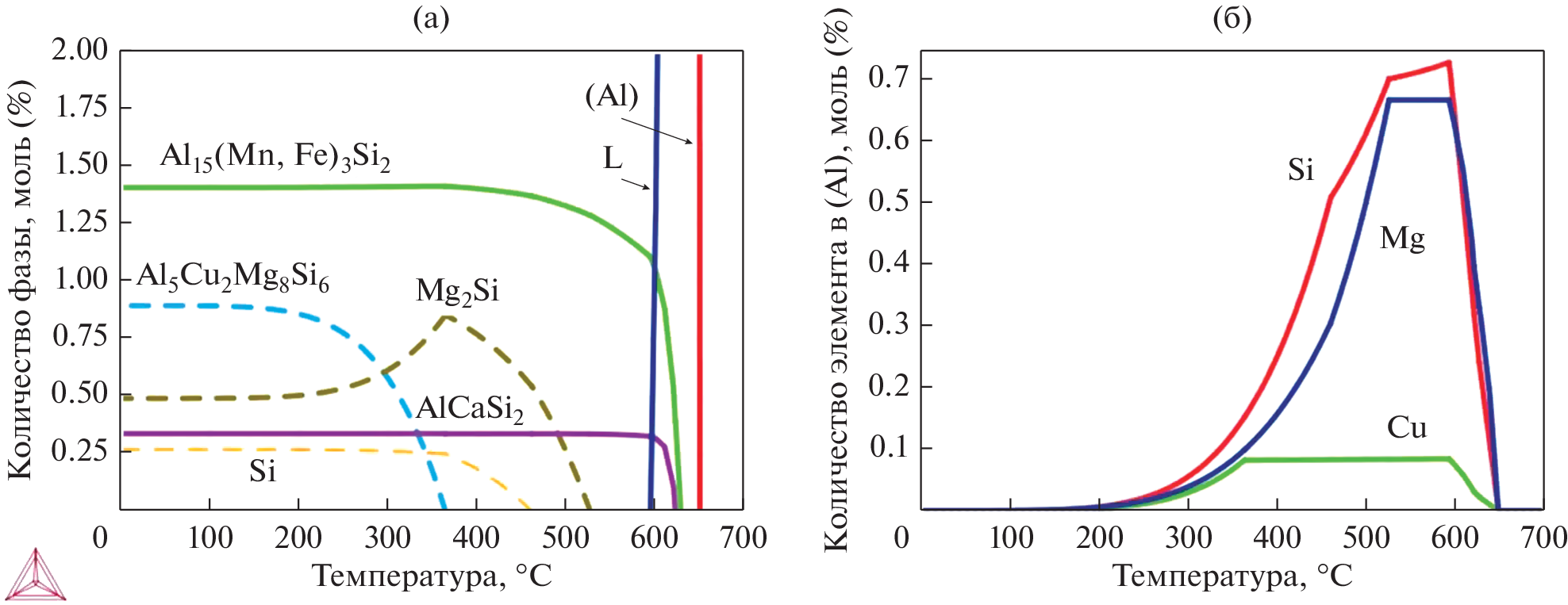 Приведены результаты исследования устойчивости пересыщенного твердого раствора (ПТР) при различных режимах закалки листов из термически упрочняемого алюминиевого сплава системы Al–Mg–Si с малой добавкой меди (Al–0.6Mg–1.0Si–0.2Cu). Образцы подвергали изотермической или непрерывной закалке с разной скоростью закалочного охлаждения, после чего проводили искусственное старение при температуре 170°С. Из результатов термодинамического моделирования равновесного фазового состава сплава установлено, что для области температур от 300 до 530°С наиболее вероятно присутствие β-фазы (Mg2Si). С применением просвечивающей электронной микроскопии и рентгеноспектрального микроанализа установлено, что при закалке распад ПТР приводит к выделению нежелательных крупных частиц метастабильных фаз β-типа или равновесной β-фазы. Зарождение выделений реализуется в виде стержнеобразных частиц по гетерогенному механизму преимущественно на поверхности дисперсоидов α-фазы (Al15(Mn,Fe)3Si2), которые таким образом значительно повышают закалочную чувствительность сплава. Образование указанных выделений при низкой скорости закалки обусловливает при последующем старении уменьшение доли и плотности образования упрочняющих частиц \(\beta {\kern 1pt} ''\)-фазы, а также приводит к увеличению их размеров и неоднородности распределения в алюминиевой матрице, что снижает потенциал дисперсионного упрочнения при старении и коррозионную стойкость материала.