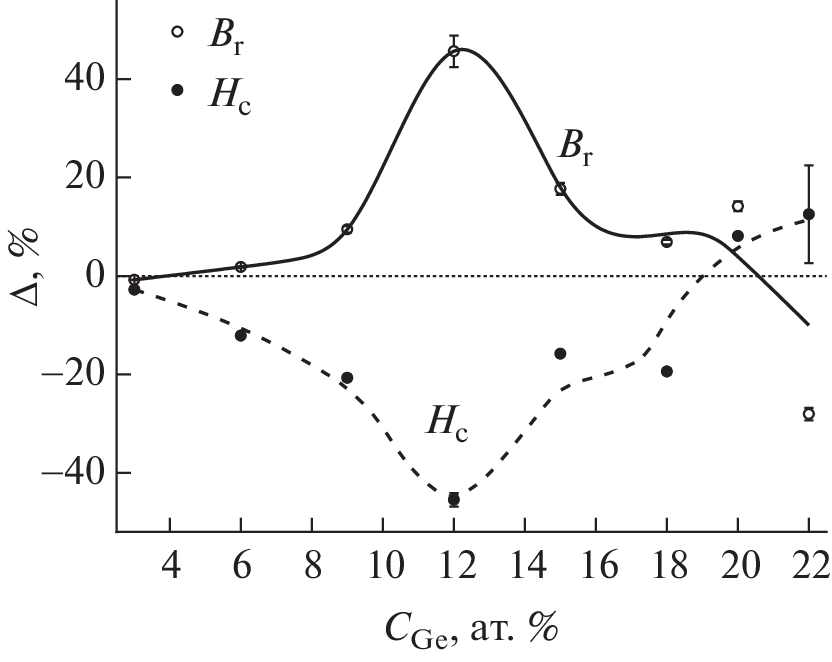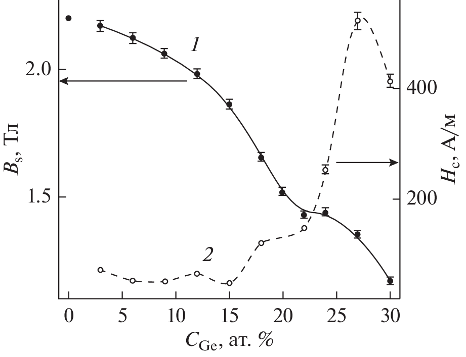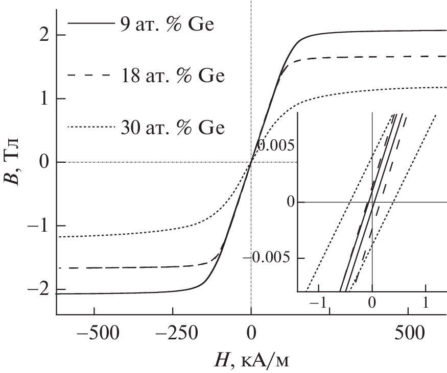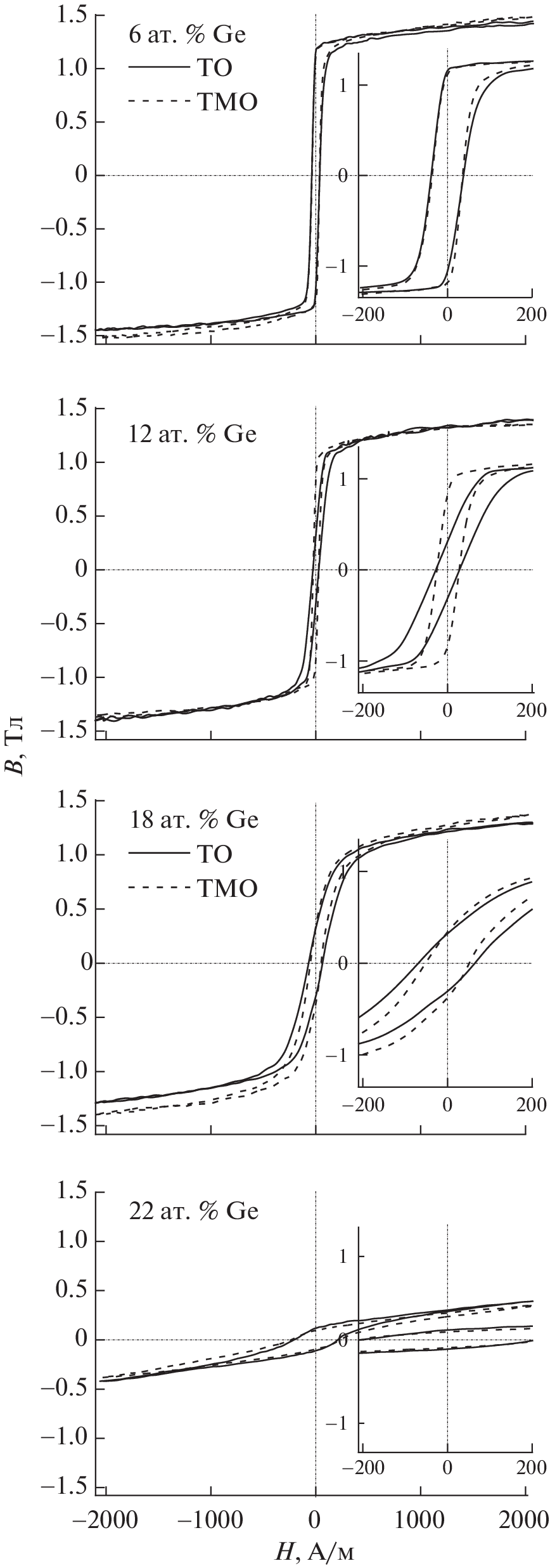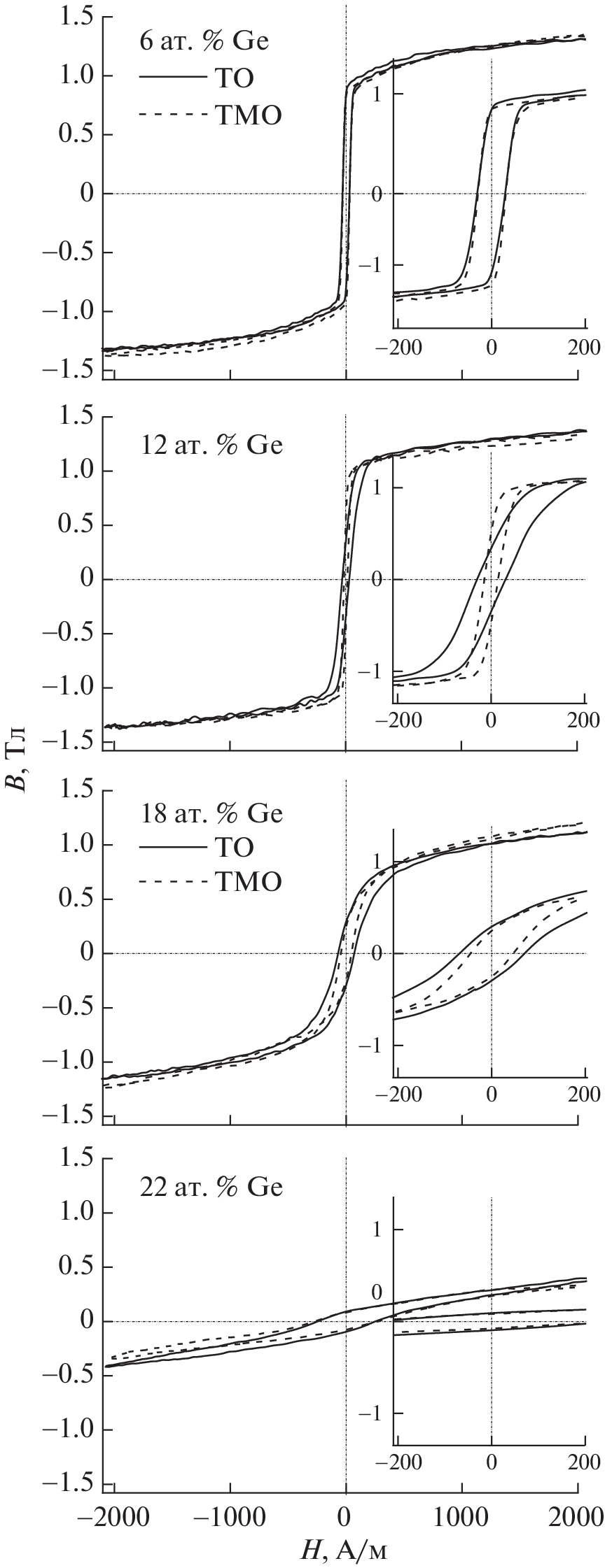 The concentration dependence of the magnetic properties of iron–germanium alloys before and after thermomagnetic treatment, which represents an annealing of alloy samples in the ferromagnetic state in a permanent or alternating magnetic field (magnetic field annealing – MFA), has been investigated. It is shown that before MFA, with an increase in the germanium content in the range of 3–30 at % Ge, the coercive force increases and the residual induction decreases. As a result of thermomagnetic treatment, in the alloy samples magnetic anisotropy is induced: the magnetic hysteresis loops become narrower, the residual induction increases, and the coercive force decreases. Thermomagnetic treatment is effective for Fe–Ge alloys with a germanium content from 6 to 18 at %, and its highest efficiency is observed at 12 at % Ge. Features of the structural state of iron–germanium alloys and their role in the formation of magnetic properties during annealing in a magnetic field are discussed.