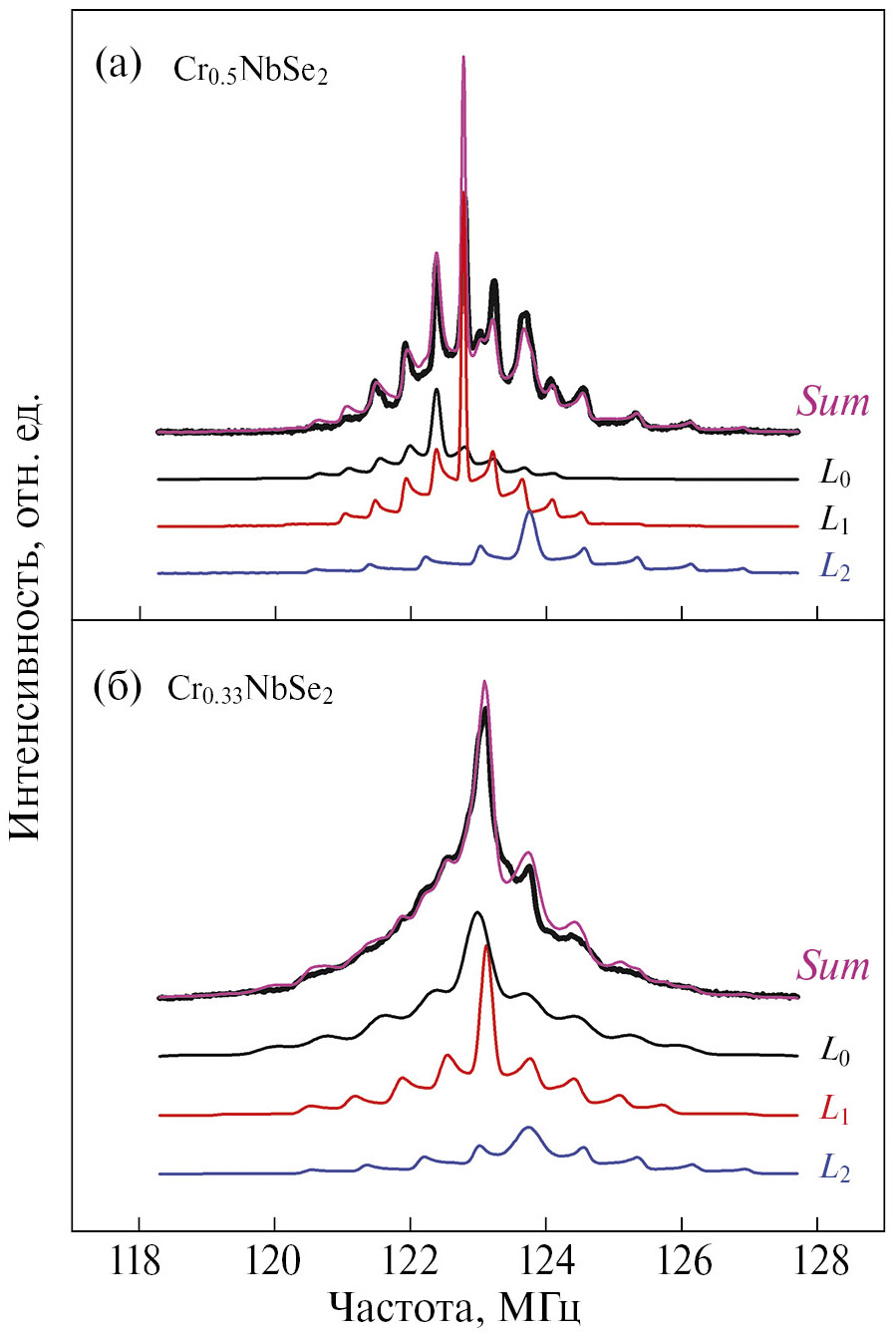 Отличие представленных на рис. 2 спектров состоит в гораздо большем уширении спектра 93Nb в Cr0.33NbSe2 по сравнению с таковым в Cr0.5NbSe2. Это говорит о наличии значительного беспорядка (магнитного и зарядового) при концентрации хрома x = 0.33, что согласуется с данными о возможном сосуществовании в данном соединении областей с разным типом упорядочения [7, 8]. Моделирование спектров 93Nb как в Cr0.33NbSe2, так и в Cr0.5NbSe2 показало, что полные экспериментальные спектры ЯМР могут быть описаны не менее чем тремя различными наборами резонансных линий, как это показано на рис. 2. Каждый такой подспектр, который мы обозначили как L0, L1 и L2, характеризуется собственным набором параметров Kα, νQ и η. Невозможность описать экспериментальный спектр одним набором резонансных линий свидетельствует о наличии в Cr0.33NbSe2 и Cr0.5NbSe2 атомов ниобия, в ближайшем окружении которых присутствует разное число атомов хрома.