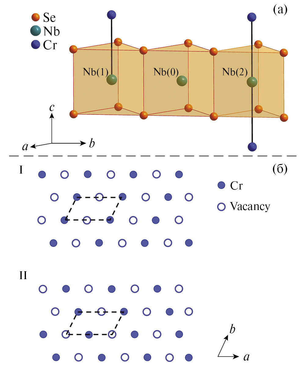 Рис. 3. Позиции Nb(0), Nb(1) и Nb(2) в CrₓNbSe₂ (а). Пример упорядочения атомов Cr в верхнем (I) и нижнем (II) слоях хрома относительно “сэндвича” Se–Nb–Se, при котором интенсивности линий ЯМР, соответствующих позициям Nb(0), Nb(1), Nb(2), соотносятся как 1:2:1 (б).
