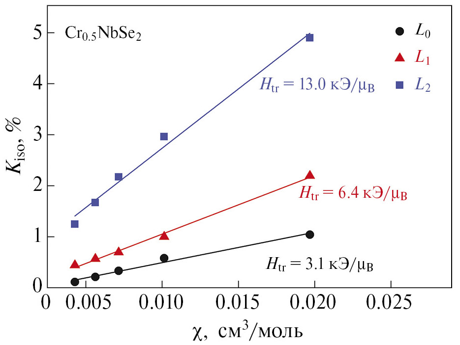 Как будет показано ниже, температурные зависимости сдвигов Kiso линий L0, L1 и L2 в Cr0.5NbSe2 имеют вид закона Кюри-Вейса, что обусловлено наведенными от ионов Cr сверхтонкими магнитными полями. Иерархия величин этих полей для ядер Nb, относящихся к линиям L0, L1 и L2, соответствует количеству ближайших к Nb соседних атомов хрома. При статистически равномерном распределении ионов Cr в слоях между блоками Se–Nb–Se ожидаются следующие относительные интенсивности линий L0, L1 и L2 – I0 = 25%, I1 = 50%, I2 = 25%.