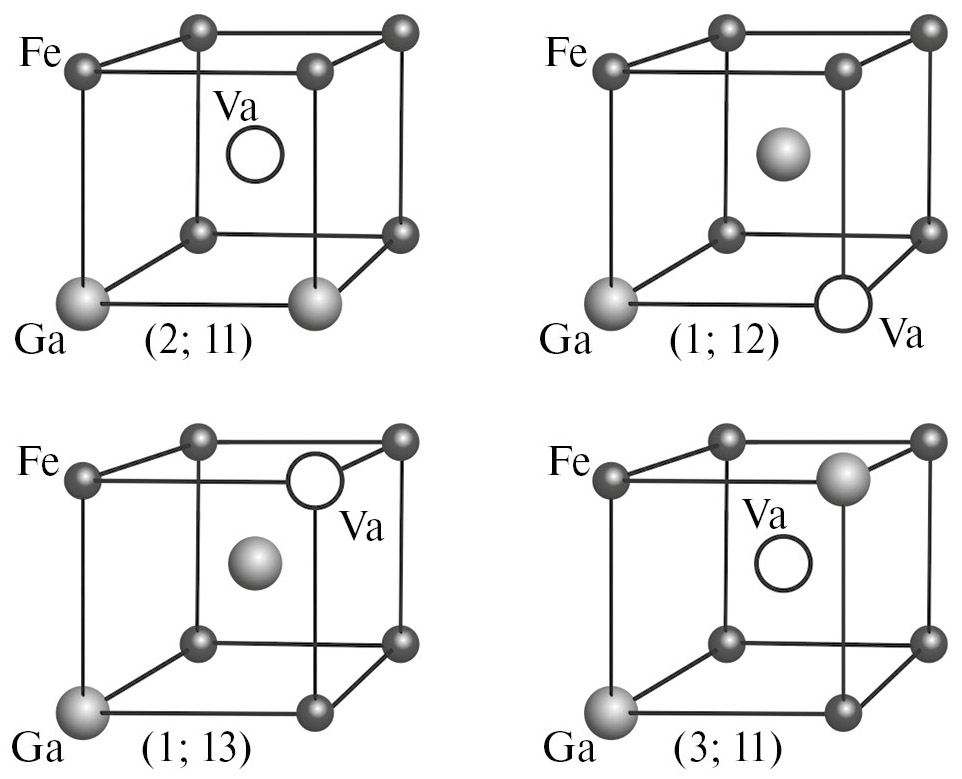 Как было показано в [30], в сплаве Fe–Si при выдержке в ферромагнитном состоянии B2-кластеры не трансформируются спонтанно в кластеры D03-фазы, поскольку на пути перестройки ближнего порядка из B2 в D03 имеется энергетический барьер, для преодоления которого требуется термическая активация. С целью выяснить возможность перестройки B2-кластеров в D03 в сплаве Fe–Ga методом PAW–VASP [49–51] мы провели первопринципный расчет энергий различных 2Ga+V конфигураций, содержащих два атома Ga и одну вакансию. Обменно-корреляционный вклад учитывался в рамках обобщенного градиентного приближения (GGA) [52]. Энергия обрезания волновых функций в PAW расчетах составляла 370 эВ. Интегрирование по зоне Бриллюэна проводилось с использованием 4 × 4 × 4 сеток k-точек. Для расчетов использовался 128-атомный кристаллит, в котором проводилась полная оптимизация по положениям атомов.