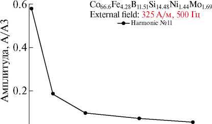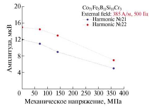 Для первого состава механические напряжения, превышающие некоторый предел (порядка 350 МПа), приводят к трансформации магнитной анизотропии, что обусловлено зависимостью константы магнитострикции от напряжений. При этом наблюдается резкое изменение гармонического спектра.
