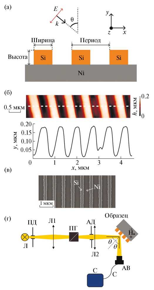 Образцы были изготовлены методами взрывной и электронно-лучевой литографии. Характеризация образцов проведена методами атомно-силовой микроскопии (АСМ, изображение и одномерное сечение изображения вдоль штриховой линии показаны на рис. 1б) и сканирующей электронной микроскопии (СЭМ, рис. 1в). Подложка представляет собой пленку никеля толщиной 200 нм, нанесенную на стекло. Нанесение никеля производили методом гальванопластики. Расчетные параметры образцов составляют: ширина 215 нм, высота 180 нм, период 700 нм. Расстояние между нанонитями подобрано таким образом, чтобы исключить их ближнепольное взаимодействие и обеспечить наличие АР, спектрально перекрывающейся с резонансами Ми отдельной нанонити. Эти параметры являются усредненными, поскольку они слабо изменялись вдоль оси нитей из-за особенностей процесса изготовления.
