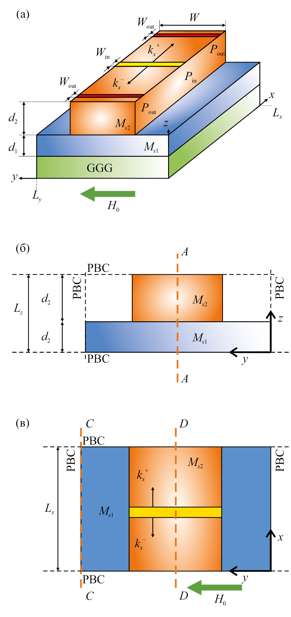 Наибольшее число работ описывают результаты, полученные при возбуждении дипольных СВ, для которых длины волн могут быть гораздо больше длины обмена в магнитных материалах. При этом для описания таких волн часто пользуются магнитостатическим приближением и поэтому их называют магнитостатические спиновые волны (МСВ). Важно отметить, что длина распространения СВ, определяемая расстоянием, на котором амплитуда СВ затухнет в e раз, варьируется от 300 нм в Ni до единиц миллиметров в пленках железо-иттриевого граната (ЖИГ). ЖИГ является технологически сложным и дорогостоящим для массового производства материалом. Поэтому продолжается поиск как новых функциональных материалов с низкими спин-волновыми потерями, так и эффективных методов компенсации затухания спиновых волн [6–10]. Частотный диапазон дипольных СВ в ферромагнитных структурах определяется в основном величиной намагниченности магнитного материала, которая может меняться от 140 кА/м для пленок ЖИГ до 1300 кА/м для сплавов CoFeB. Для практических применений обычно используются пленки ЖИГ, выращенные методами жидкофазной эпитаксии на подложках из галлий–гадолиниевого граната (ГГГ), поскольку рекордно низкие параметры потерь в таких структурах позволяют уже создавать, например, микроразмерные интерферометры и устройства магнонной логики [11–14]. Одной из важных задач на пути создания магнонных устройств является возбуждение СВ в структурах на основе тонкопленочных микроволноводов. Традиционный индуктивный метод возбуждения СВ заменяется методикой возбуждения волновых пакетов СВ и непрерывных сигналов в пленках с созданными неоднородностями [15, 16]. Для расширения частотного диапазона устройств магноники перспективными являются двуслойные магнитные пленки [17, 18].