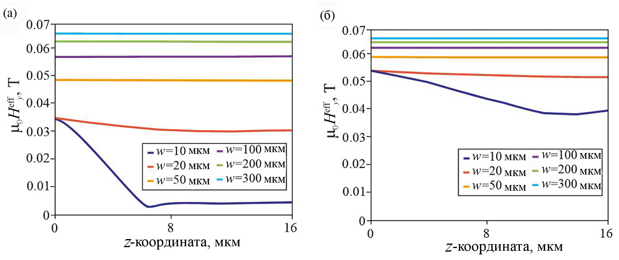 Таким образом, характер распределения внутренних статических полей в исследуемых структурах существенно зависит от ширины волновода w. При уменьшении w и приближении к критической ширине волновода wc ~ 20 мкм распределение поля в форме “вала” сменяется на распределение в форме “долины”. Обобщая полученные результаты, можно утверждать, что при d2 ≈ d1 и фиксированном w критическим значением является величина , зависящая в свою очередь от соотношения намагниченностей насыщения подложки и волновода. Такие особенности трансформации внутреннего магнитного поля исследуемых структур в зависимости от ширины волновода отражаются и на спектре спин-волновых возбуждений, представляющих собой аналог гребенчатого волновода в интегрально оптических структурах. По сравнению с экспериментально и численно исследованной структурой гребенчатого волновода на основе пленки пермаллоя [23], в рассматриваемой структуре на основе двух слоев ЖИГ появляется возможность трансформации статических внутренних магнитных полей путем изменения намагниченности одного из слоев. В то же время двуслойные магнитные пленки можно использовать для создания меандровых волноводов для фильтрации спин-волновых сигналов [24]. При этом преимуществом гребенчатых двуслойных ЖИГ микроволноводов будет являться наличие двух разделенных рабочих диапазонов частот СВ [25]. Далее будут рассмотрены спектры СВ в таких структурах. При этом отдельное внимание будет уделено спектрам ширинных мод [26, 27].