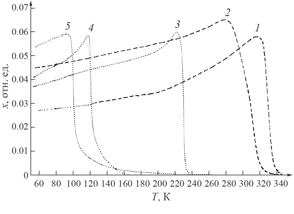 Рис. 1. Магнитная восприимчивость лент NiWx, где 1 – х=5.0% (EVICO), 2 – х=5.5%, 3 – х=6.0%, 4 – х=7.4%, 5 – х=7.7%.