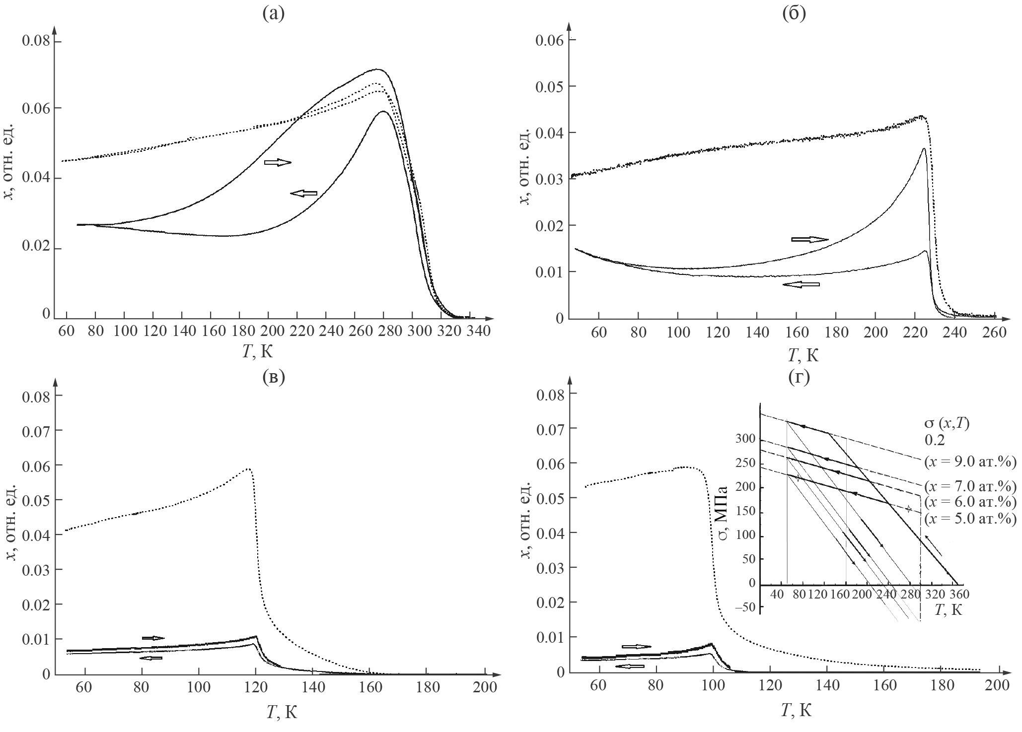 Для создания плоского напряжения образцы NiWx приклеивали между двумя одинаковыми пластинками из Si или D16T (алюминиевый сплав) с помощью клея БФ2. Пластинки имели форму круга диаметром 8 мм и толщиной 0.5 мм. Клей наносили на всю поверхность NiWx образца. Сушку клеевого соединения проводили при температуре Тсуш=360 К. В зависимости от знака DКТР (DКТР = КТРNiW – КТРSi > 0, DКТР = = КТРNiW – КТРD16T < 0) при понижении температуры в образце возникает и растет плоское однородное напряжение растяжения или сжатия соответственно. Максимально достижимое значение напряжения ограничивается пределом упругости s0.2 материала ленты NiWх и используемых пластин. Предел упругости материалов пластин намного превышает предел упругости s0.2 сплавов NiWх [7, 14-23], представленный пунктирными линиями на вставке рис. 2г . Температурные зависимости внутренних механических напряжений s(T), рассчитанные на основании экспериментальных значений КТР, модуля Юнга и s0.2 для склеек Si–NiWх также представлены на вставке рис. 2г. Для пары Si–NiWx при охлаждении в NiWx возникает напряжение растяжения. При уменьшении температуры ниже Т(s = s0.2) в материале начинается пластическое течение и возникает остаточная деформация. В начале нагревания образцов от 50 К уменьшение напряжения происходит благодаря упругой деформации. По мере роста температуры напряжение может изменить знак. Следствием возникновения остаточной деформации является возникновение гистерезиса на зависимостях s(Т) и c(T, s).