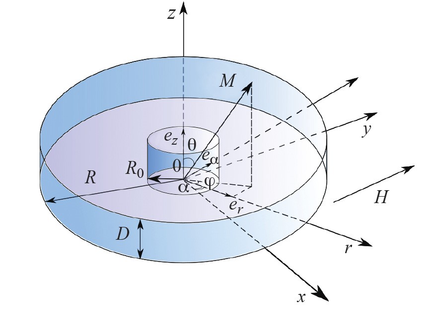 Рассматривается одноосный ферромагнетик в форме диска, в котором присутствует дефект в виде цилиндра радиусом с осью симметрии, совпадающей с аналогичной осью диска и направленной вдоль (рис. 1).