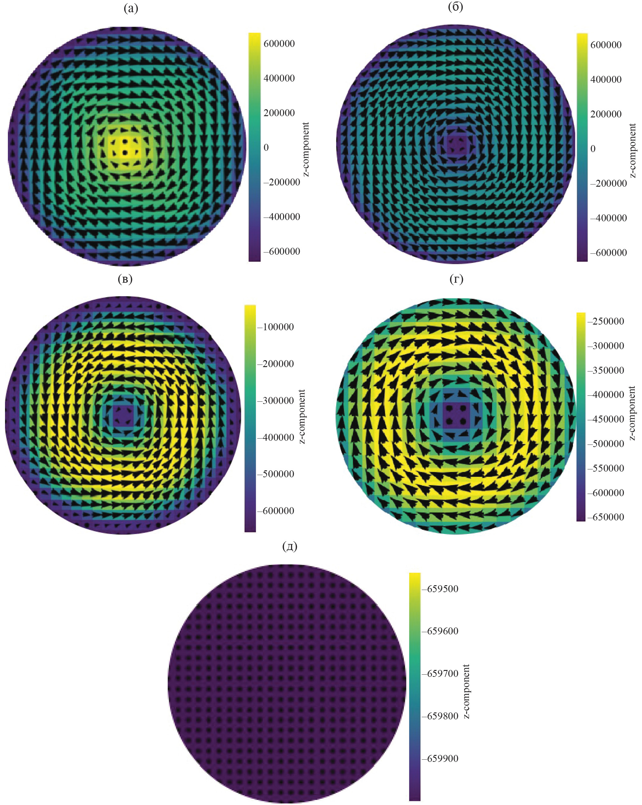Изучение поведения вихреподобных неоднородностей в магнитном поле можно провести по крайней мере двумя способами: первый – прямое численное интегрирование уравнения Эйлера–Лагранжа, соответствующего (5), второй – микромагнитное моделирование с помощью пакета программ открытого доступа OOMMF [19]. Первый достаточно информативен в том смысле, что метод позволяет найти зависимость параметров вихреподобных неоднородностей (размеры, энергию, максимальный угол отклонения вектора m от оси в нетопологическом солитоне и т.д.) от материальных параметров и величины поля. Он дает практически полную картину физических процессов, связанных с этими неоднородностями, но не во всех случаях. В частности, как показывают расчёты [14], при действии магнитного поля на магнитный скирмион (неоднородность третьего типа) он уменьшается в размерах. При достижении критического поля он может схлопнуться и исчезнуть посредством флуктуационного механизма [20], так как при его энергия становится больше энергии однородного состояния. Однако он может также превратиться в нетопологический солитон, так как в окрестности их энергия сравнивается). Таким образом, вопрос о сценарии перемагничивания магнитного скирмиона остаётся открытым. Поэтому было принято решение исследовать данный процесс с помощью пакета программ открытого доступа OOMMF, чтобы получить реальную доменную структуру образца. Например, если вне дефекта в диске в реальности может существовать лабиринтная доменная структура, то эту структуру можно визуализировать с помощью OOMMF. Параметры образца, представляющего одноосный ферромагнетик, взятого в виде диска и содержащего колумнарный дефект с пониженной константой Ku, брали при следующих значениях [21]: R = 300 нм, D = 30 нм, R0 = 30 нм, A1 = 2.5 ∙ 10–13 Дж/м, K = 3 ∙ 104 Дж/м3, Ku2 = –0.5 ∙ 104 Дж/м3, Ms = 6.6 ∙ 105 А/м. Размеры ячейки разбиения брали как 1.5 × 1.5 × 1.5 нм, при этом ширина доменной границы Результаты расчётов в пакете OOMMF процесса перемагничивания исследуемого диска с дефектом в перпендикулярном магнитом поле представлены на рис. 2. Необходимо отметить, что по толщине диска здесь будет 20 слоев, и в каждом из них распределения намагниченности будут отличаться друг от друга. При этом распределение вектора m в срединных слоях (с 7 по 14) практически не отличаются друг от друга. Однако, начиная с 15 и по 20 слой (аналогично с 1 по 6), начинаются отклонения от распределения намагниченности в срединных слоях (в 20 слое отличается примерно на 50%). На рис. 2 и рис. 4 представлена визуализация распределения m в срединных слоях (10, 11).