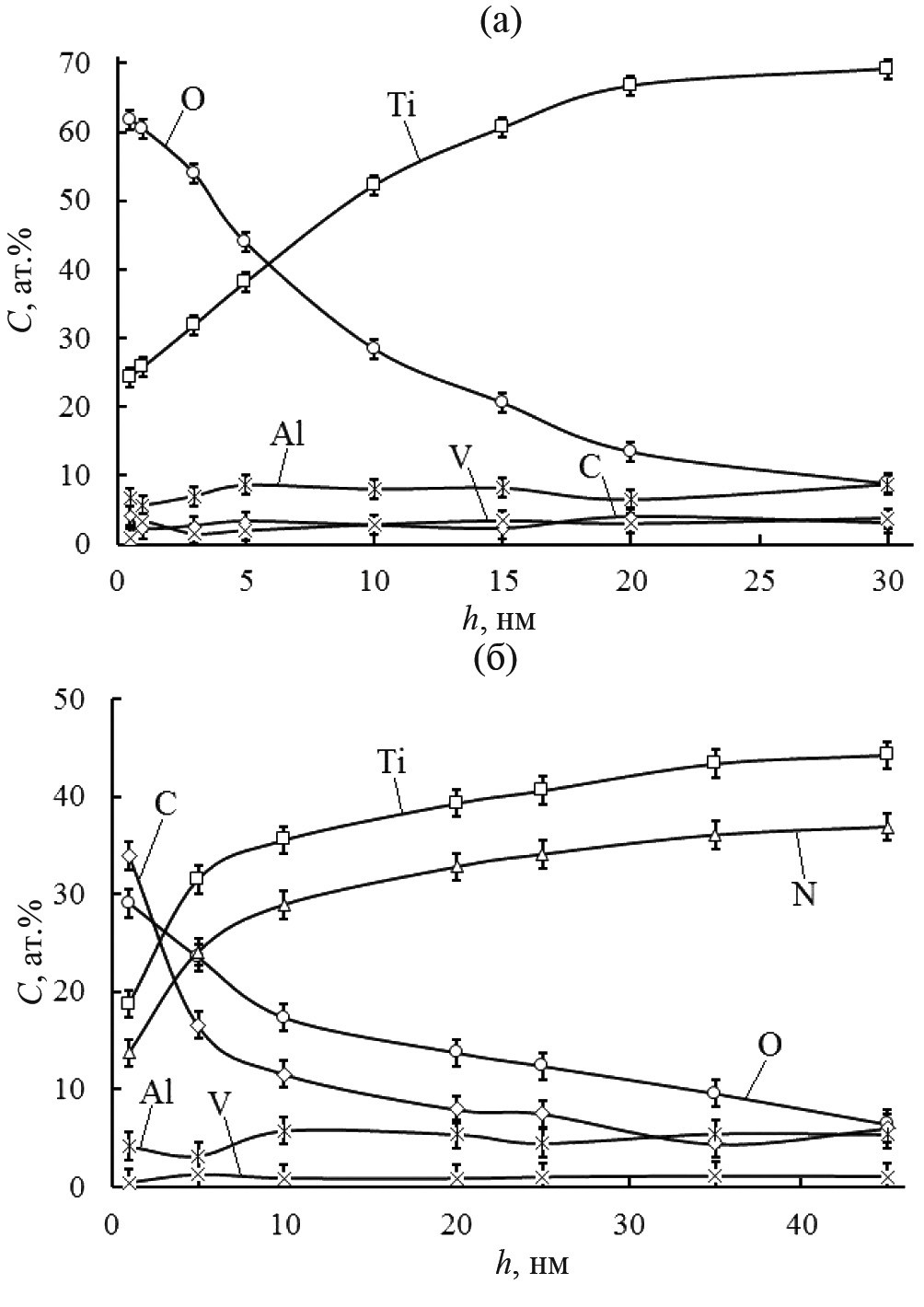 На рис. 1 представлены профили распределения элементов в поверхностных слоях образцов титанового сплава ВТ6 в исходном состоянии (рис. 1а) и после облучения ионами N+ (рис. 1б), полученные методом РФЭС.