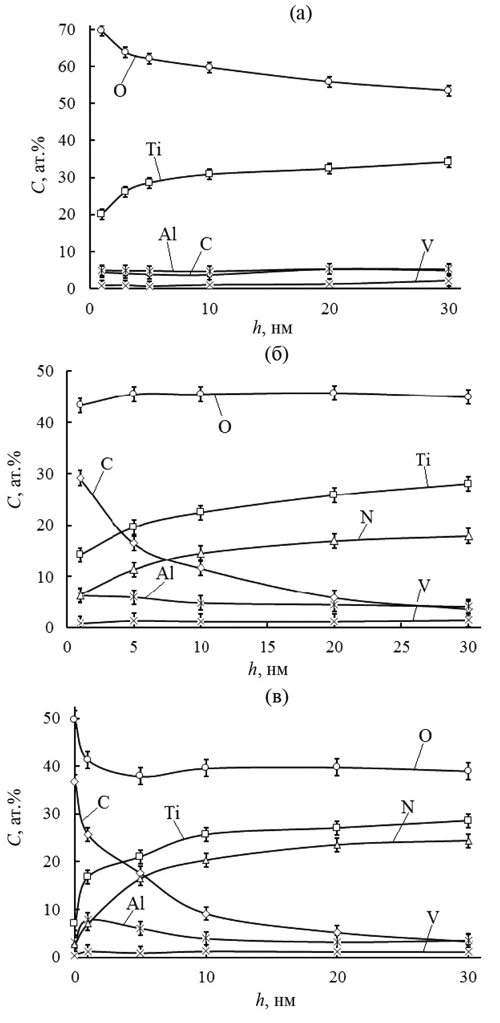 Рис. 2. Профили распределения элементов в образцах сплава ВТ6 после имплантации ионов O+ (а), после поочередного облучения ионами O+ и N+ с дозой ионов N+ 1018 ион/см2 (б) и после поочередного облучения ионами O+ и N+ с дозой ионов N+ 3·1018 ион/см2 (в).
