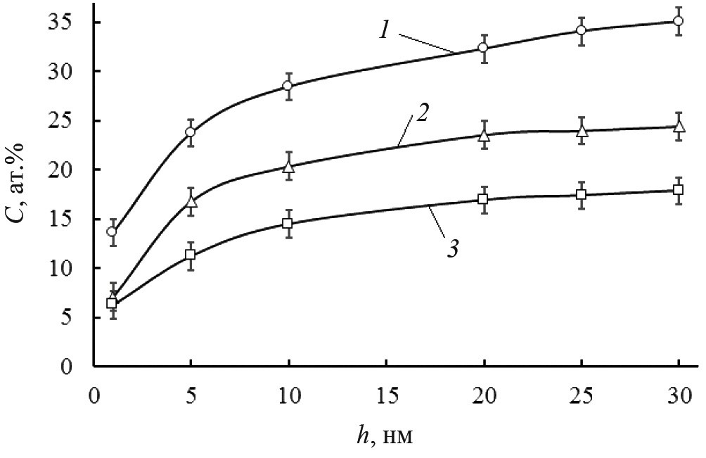Рис. 3. Профили распределения азота в образцах ВТ6, совмещенные в один график: 1 –имплантация ионов N+, 2 – имплантация ионов O+ и N+ с дозой ионов N+ 3·1018 ион/см2, 3 – имплантация ионов O+ и N+ с дозой ионов N+ 1018 ион/см2.