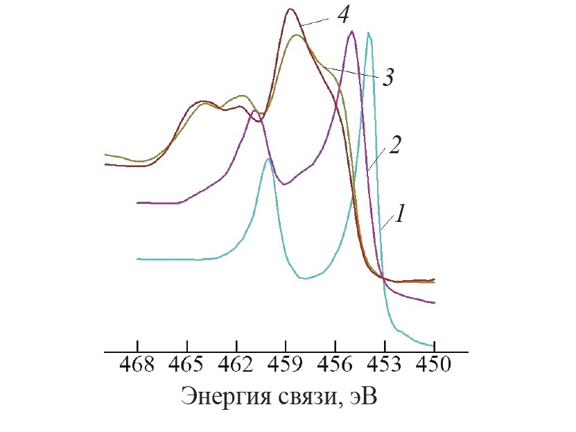 Рис. 6. РФЭ-спектр Ti 2p, полученный с глубины ~ 20 нм, в исходном образце BT6 (1), в образце BT6 после имплантации ионов N+ (2), после поочередного облучения с дозой ионов N+ 1018 ион/см2 (3), после поочередного облучения с дозой ионов N+ 3·1018 ион/см2 (4).