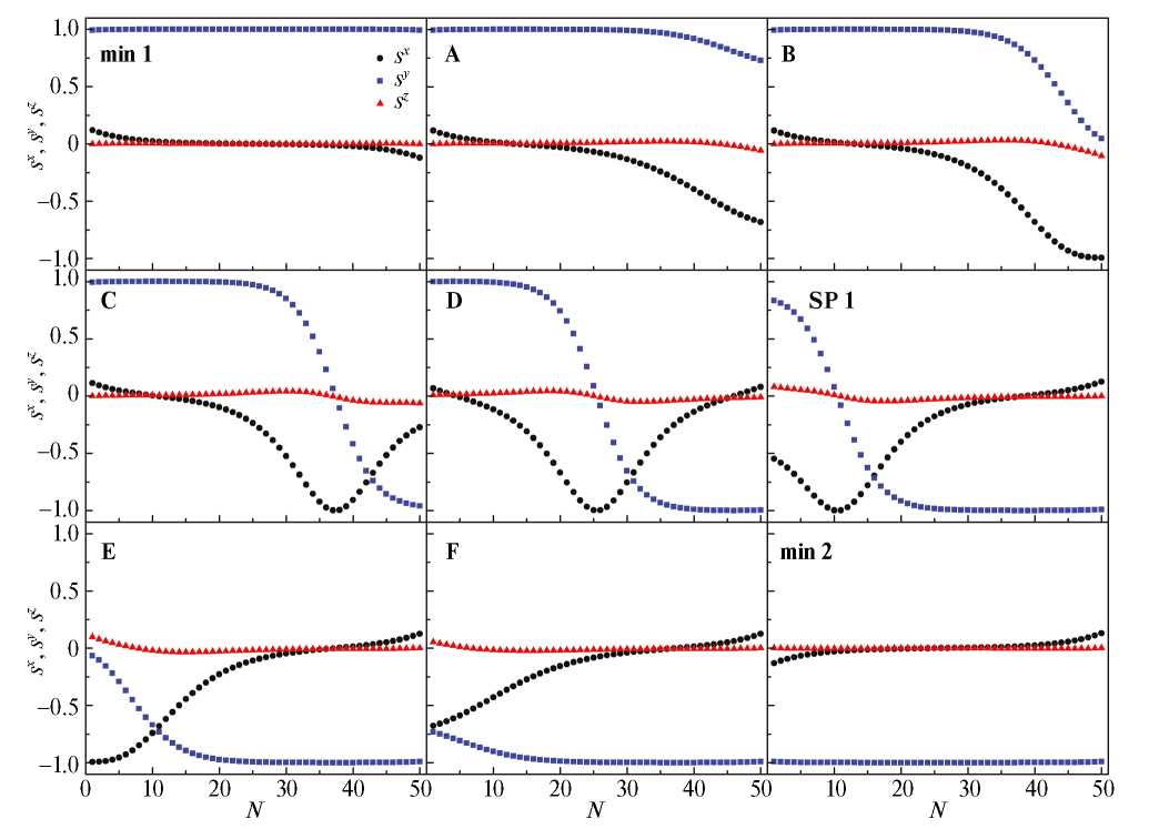 Рис. 3. Последовательные изображения магнитного состояния цепочки из 50 атомов Co при ее перемагничивании во внешнем магнитном поле By = 1 Тл посредством формирования антидоменной стенки. Начальное состояние, седловая точка и конечное состояние обозначены как min 1, SP 1 и min 2 соответственно. Промежуточные изображения (A, B, C, D, E, F) показаны для наглядности. Обозначения соответствуют энергетической диаграмме на рис. 4a.