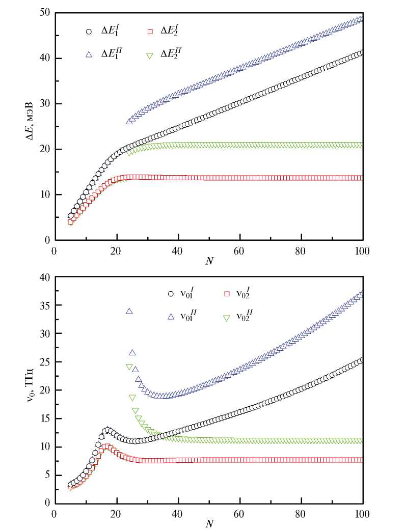 Рис. 5. Зависимости энергетических барьеров ΔE и частотных префакторов ν0 для перемагничивания цепочки из атомов Co от длины цепочки N. Внешнее магнитное поле By = 1 Tл.