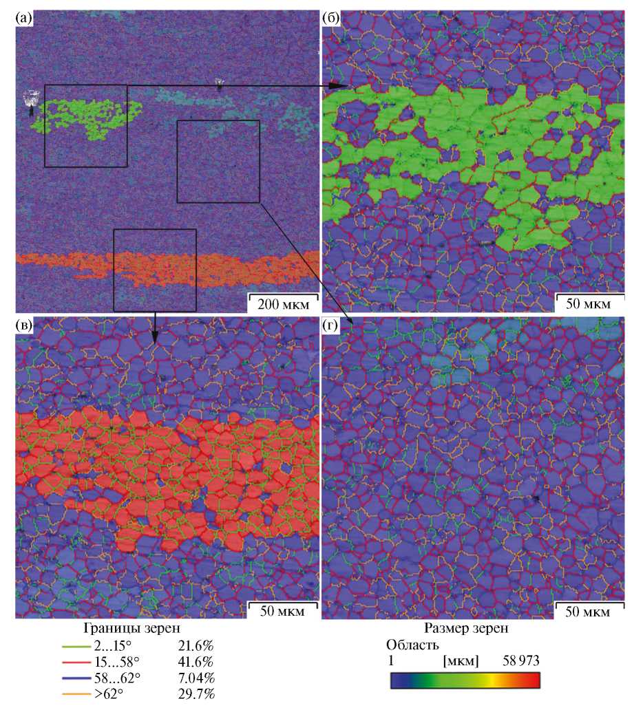 На рис. 5 представлены ДОРЭ-карты в другой модификации: в виде карт распределения α-зерен по кристаллографическим ориентациям, в том числе в виде увеличенных фрагментов ДОРЭ-карты (рис. 5б–г). Совпадение цвета различных α-зерен на ДОРЭ-картах (рис. 5), определяемого стандартным треугольником обратной полюсной фигуры (ОПФ), и совпадение проекций элементарной ячейки α-ГПУ фазы характеризуют близость кристаллографической ориентации данных зерен. Видно, что доминируют более широкие слои близко ориентированных вдоль TD α-зерен с красно-розовой окраской (с полюсами ОПФ, близкими 0001 и 011). Но есть и короткие цепочки зерен одного цвета, которые имеют синюю (полюс 010) или зеленую (полюс 20) цветовые кодировки на ОПФ. Все они отвечают, соответственно, базисной, пирамидальной и призматической плоскостям, которые параллельны плоскости поперечного сечения (RD). Установлено, что при размерной близости α-зерен в плоскости прокатки (ND) и поперечном сечении (RD) их распределение по кристаллографическим ориентациям, определяющее текстуру, принципиально отличается [34].