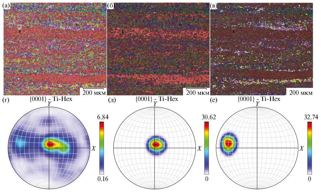 На рис. 7 приведены интегральная ДОРЭ-карта (рис. 7а) и прямая полюсная фигура (ППФ) (рис. 7г), на рис. 7б выделены α-зерна только той ориентации, которая представлена полюсом, отвечающим нормали к базисным плоскостям α-фазы на соответствующей частичной ППФ (рис. 7д). Т. е. как и в предыдущем анализе ДОРЭ-карт установлено, что преобладают α-зерна, залегающие базисными плоскостями в поперечном сечении (RD), и, соответственно, им перпендикулярны оси с, параллельные RD. В свою очередь, рис. 7в, е демонстрируют наличие α-зерен с плоскостью, близкой призматической, в поперечном сечении (RD).