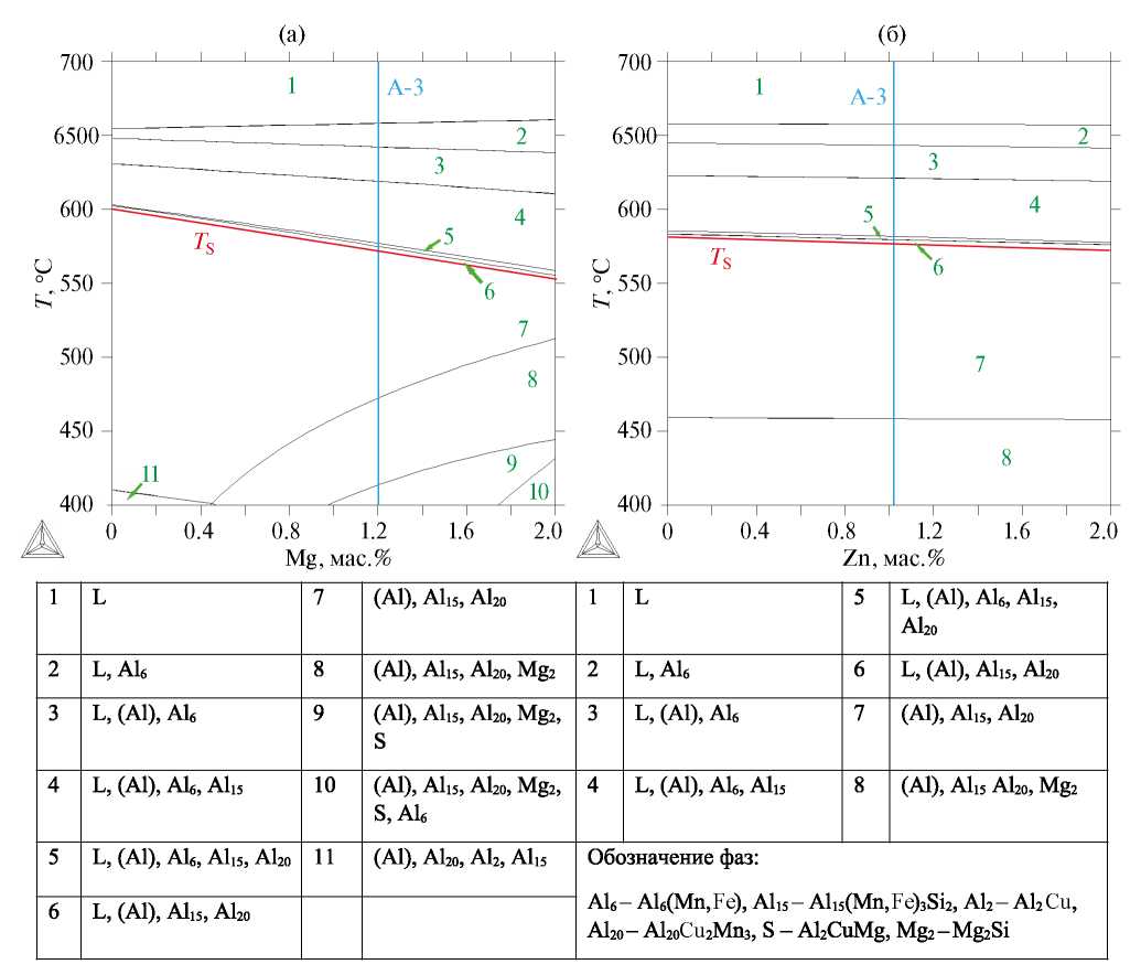 Рис. 1. Политермические сечения системы Al–Cu–Mn–Fe–Si–Mg–Zn при 2%Cu, 1.5%Mn, 0.4%Fe и 0.4%Si: (а) при 1%Zn; (б) при 1%Mg.