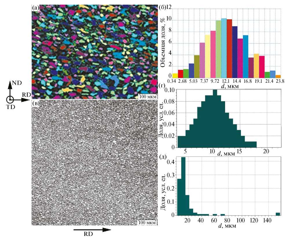 Рис. 2. ОМ- (а) и РЭМ SE-изображения структуры (в) в поперечном сечении плиты (TD) и гистограммы распределения α-зерен по размерам (б, г, д). Указаны направления нормалей к плоскостям прокатки (ND) и поперечных (TD) и (RD) сечений.