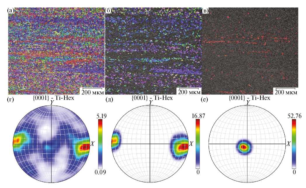 Для определения кристаллографических ориентаций нормалей α-зерен в поперечном сечении (TD) были построены прямые полюсные фигуры (ППФ) (см. рис. 7) и типичные стандартные треугольники ОПФ в трех проекциях X, Y, Z (см. рис. 8). На рис. 7а, г представлена интегральная ДОРЭ-карта и ей соответствующая ППФ. При этом на рис. 7б и в выделены α-зерна только той ориентации, полюсы которой на соответствующей ППФ (рис. 7д, е) отвечают нормалям к призматическим или базисным плоскостям α-фазы. Обнаружено, что преобладают α-зерна, залегающие призматическими плоскостями в поперечном сечении (TD), и, соответственно, им параллельны оси с, в свою очередь, с||RD (рис. 7б, д). Кроме того, рис. 7в и е демонстрируют меньшее количество α-зерен с базисной плоскостью, параллельной поперечному сечению (TD). В этом случае с||TD.