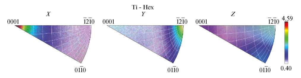 На рис. 8 видно, что цветом явно выделяются полюсы нормалей к базисной (0001) и призматической (0110) плоскостям в сечении Z||TD. Для проекции X полюсная плотность выше для полюса, близкого к нормалям базисных плоскостей (0001), а для проекции Y — полюсу нормалей призматических плоскостей (20). Наряду с основными полюсами видны “рассеянные” распределения полюсов от других произвольно ориентированных α-зерен, практически заполняющие поля всех треугольников ОПФ. В целом данные на рис. 1–8 согласуются между собой и находятся в кристаллографическом соответствии с результатами аналогичных исследований в наших предыдущих работах [33, 34].